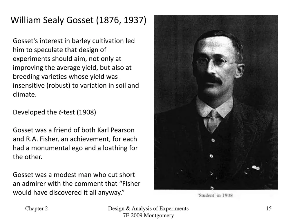 http://upload.wikimedia.org/wikipedia/commons/thumb/4/42/William_Sealy_Gosset.jpg/240px-William_Sealy_Gosset.jpghttp://upload.wikimedia.org/wikipedia/commons/thumb/4/42/William_Sealy_Gosset.jpg/240px-William_Sealy_Gosset.jpg William Sealy Gosset (1876, 1937) Gosset's interest in barley cultivation led him to speculate that design of experiments should aim, not only at improving the average yield, but also at breeding varieties whose yield was insensitive (robust) to variation in soil and climate. Developed the t-test (1908) Gosset was a friend of both Karl Pearson and R.A. Fisher, an achievement, for each had a monumental ego and a loathing for the other. Gosset was a modest man who cut short an admirer with the comment that Fisher would have discovered it all anyway. Chapter 2 Design & Analysis of Experiments 7E 2009 Montgomery 15