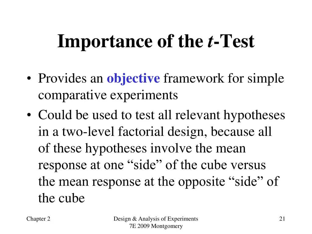Importance of the t-Test Provides an objective framework for simple comparative experiments Could be used to test all relevant hypotheses in a two-level factorial design, because all of these hypotheses involve the mean response at one side of the cube versus the mean response at the opposite side of the cube Chapter 2 Design & Analysis of Experiments 7E 2009 Montgomery 21