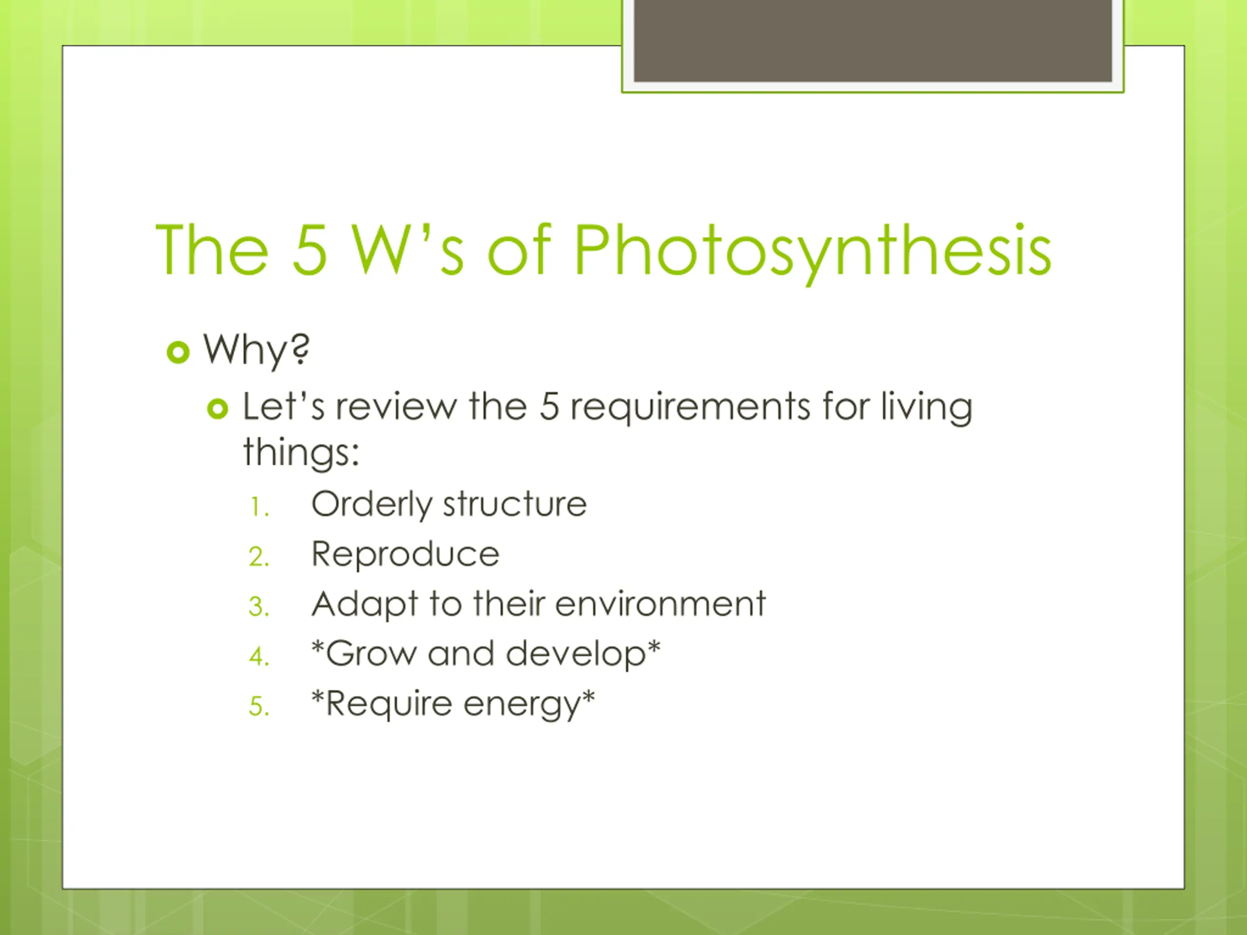 The 5 Ws of Photosynthesis Why? Let s review the 5 requirements for living things: Orderly structure Reproduce Adapt to their environment *Grow and develop* *Require energy* 1. 2. 3. 4. 5.