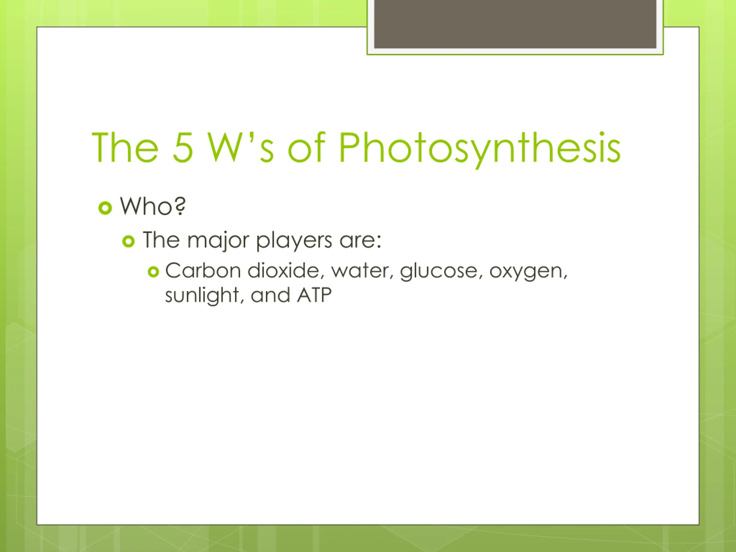 The 5 Ws of Photosynthesis Who? The major players are: Carbon dioxide, water, glucose, oxygen, sunlight, and ATP