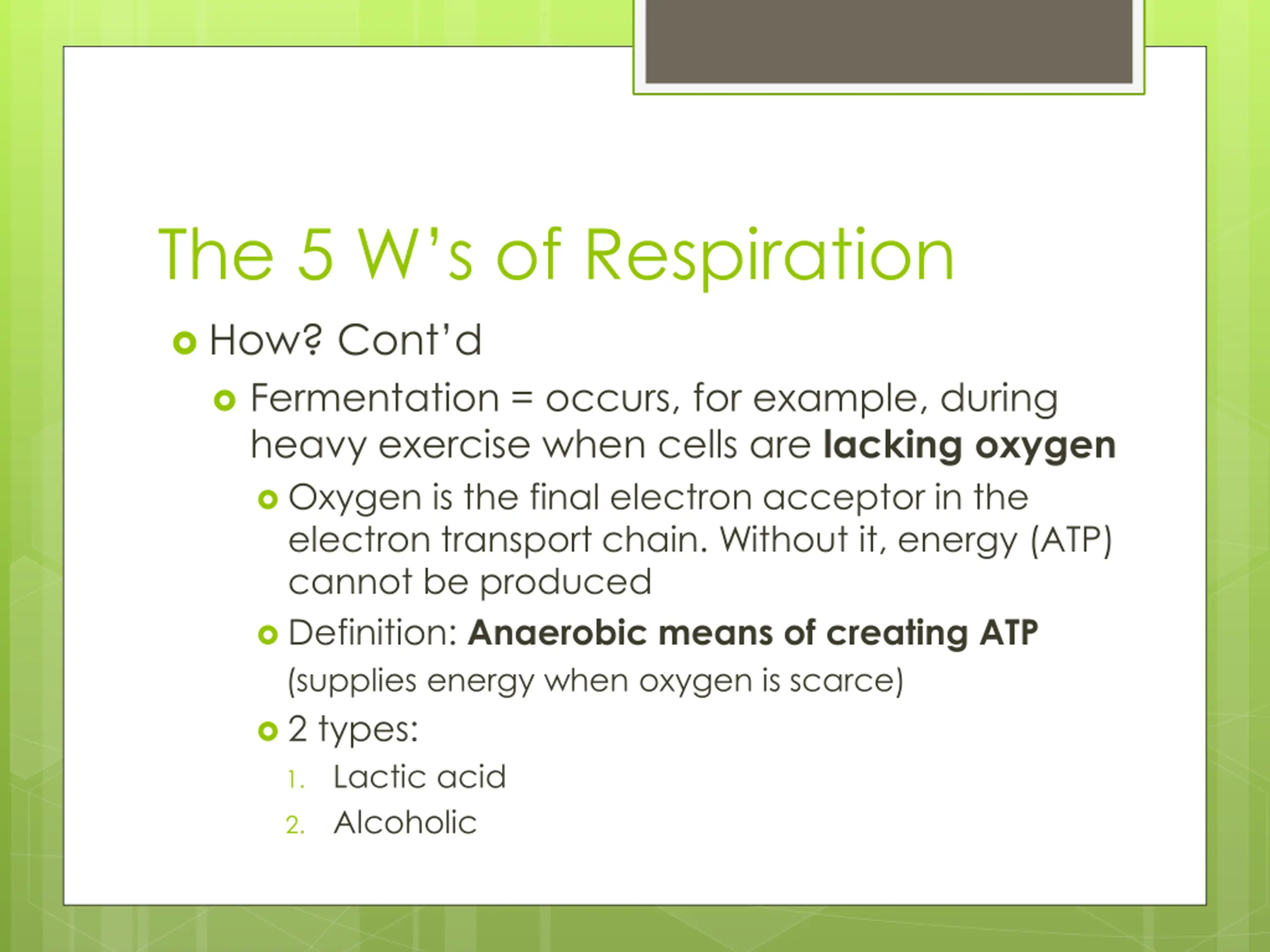 The 5 Ws of Respiration How? Cont d Fermentation = occurs, for example, during heavy exercise when cells are lacking oxygen Oxygen is the final electron acceptor in the electron transport chain. Without it, energy (ATP) cannot be produced Definition: Anaerobic means of creating ATP (supplies energy when oxygen is scarce) 2 types: 1. Lactic acid 2. Alcoholic
