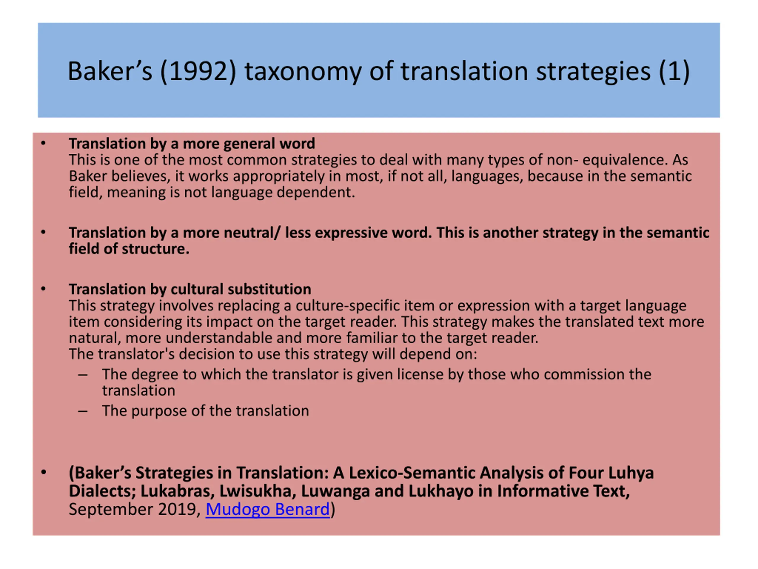 Bakers (1992) taxonomy of translation strategies (1) Translation by a more general word This is one of the most common strategies to deal with many types of non- equivalence. As Baker believes, it works appropriately in most, if not all, languages, because in the semantic field, meaning is not language dependent. Translation by a more neutral/ less expressive word. This is another strategy in the semantic field of structure. Translation by cultural substitution This strategy involves replacing a culture-specific item or expression with a target language item considering its impact on the target reader. This strategy makes the translated text more natural, more understandable and more familiar to the target reader. The translator's decision to use this strategy will depend on: The degree to which the translator is given license by those who commission the translation The purpose of the translation (Baker s Strategies in Translation: A Lexico-Semantic Analysis of Four Luhya Dialects; Lukabras, Lwisukha, Luwanga and Lukhayo in Informative Text, September 2019, Mudogo Benard)