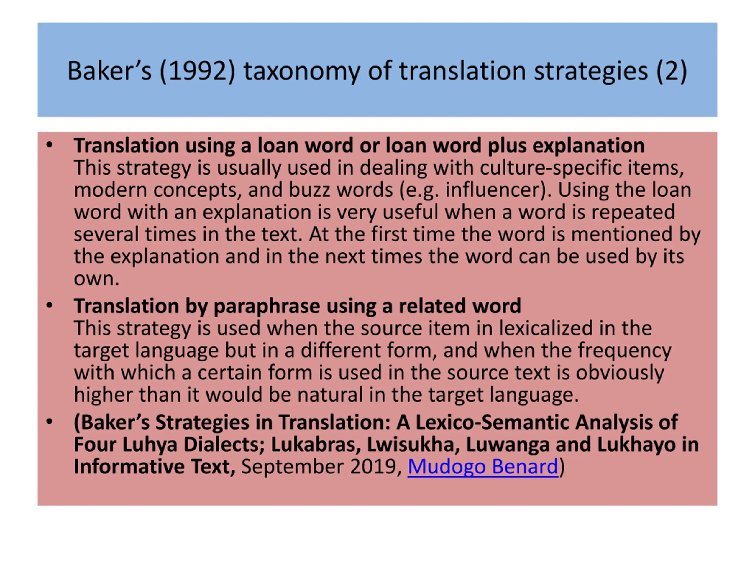 Bakers (1992) taxonomy of translation strategies (2) Translation using a loan word or loan word plus explanation This strategy is usually used in dealing with culture-specific items, modern concepts, and buzz words (e.g. influencer). Using the loan word with an explanation is very useful when a word is repeated several times in the text. At the first time the word is mentioned by the explanation and in the next times the word can be used by its own. Translation by paraphrase using a related word This strategy is used when the source item in lexicalized in the target language but in a different form, and when the frequency with which a certain form is used in the source text is obviously higher than it would be natural in the target language. (Baker s Strategies in Translation: A Lexico-Semantic Analysis of Four Luhya Dialects; Lukabras, Lwisukha, Luwanga and Lukhayo in Informative Text, September 2019, Mudogo Benard)