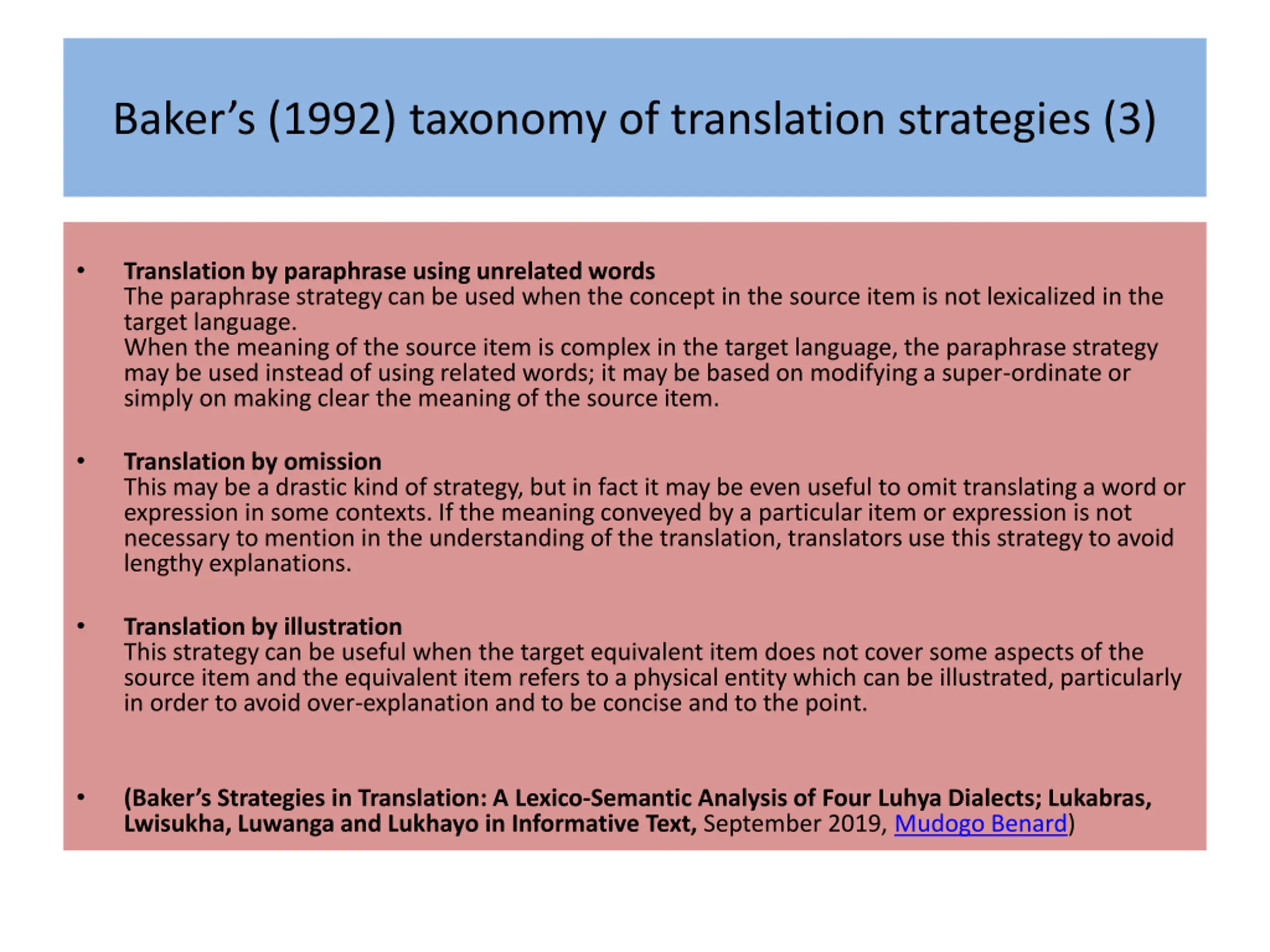 Bakers (1992) taxonomy of translation strategies (3) Translation by paraphrase using unrelated words The paraphrase strategy can be used when the concept in the source item is not lexicalized in the target language. When the meaning of the source item is complex in the target language, the paraphrase strategy may be used instead of using related words; it may be based on modifying a super-ordinate or simply on making clear the meaning of the source item. Translation by omission This may be a drastic kind of strategy, but in fact it may be even useful to omit translating a word or expression in some contexts. If the meaning conveyed by a particular item or expression is not necessary to mention in the understanding of the translation, translators use this strategy to avoid lengthy explanations. Translation by illustration This strategy can be useful when the target equivalent item does not cover some aspects of the source item and the equivalent item refers to a physical entity which can be illustrated, particularly in order to avoid over-explanation and to be concise and to the point. (Baker s Strategies in Translation: A Lexico-Semantic Analysis of Four Luhya Dialects; Lukabras, Lwisukha, Luwanga and Lukhayo in Informative Text, September 2019, Mudogo Benard)