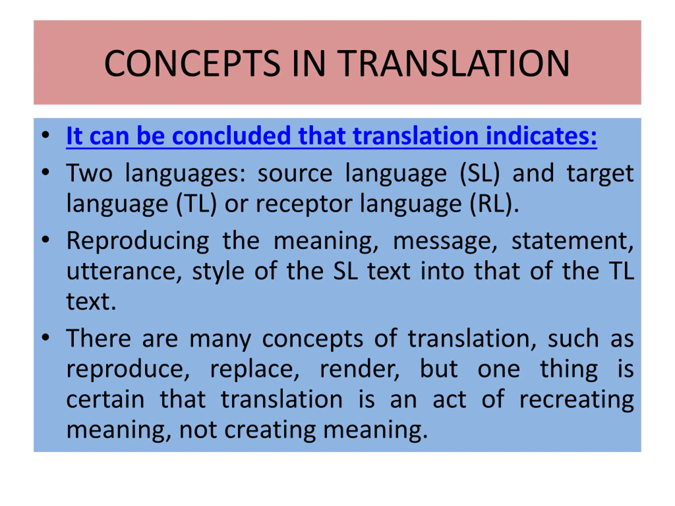 CONCEPTS IN TRANSLATION It can be concluded that translation indicates: Two languages: source language (SL) and target language (TL) or receptor language (RL). Reproducing the meaning, message, statement, utterance, style of the SL text into that of the TL text. There are many concepts of translation, such as reproduce, replace, render, but one thing is certain that translation is an act of recreating meaning, not creating meaning.