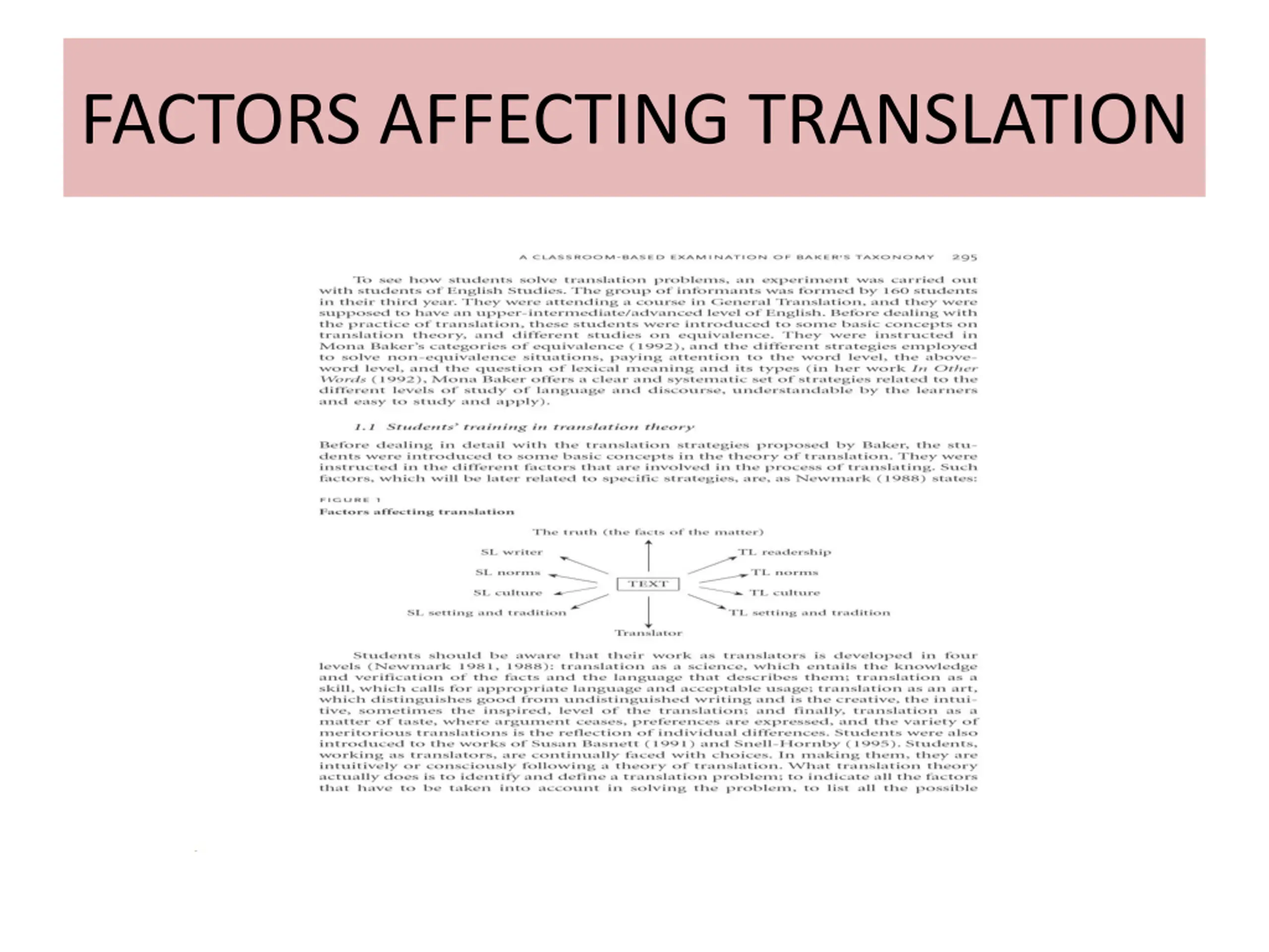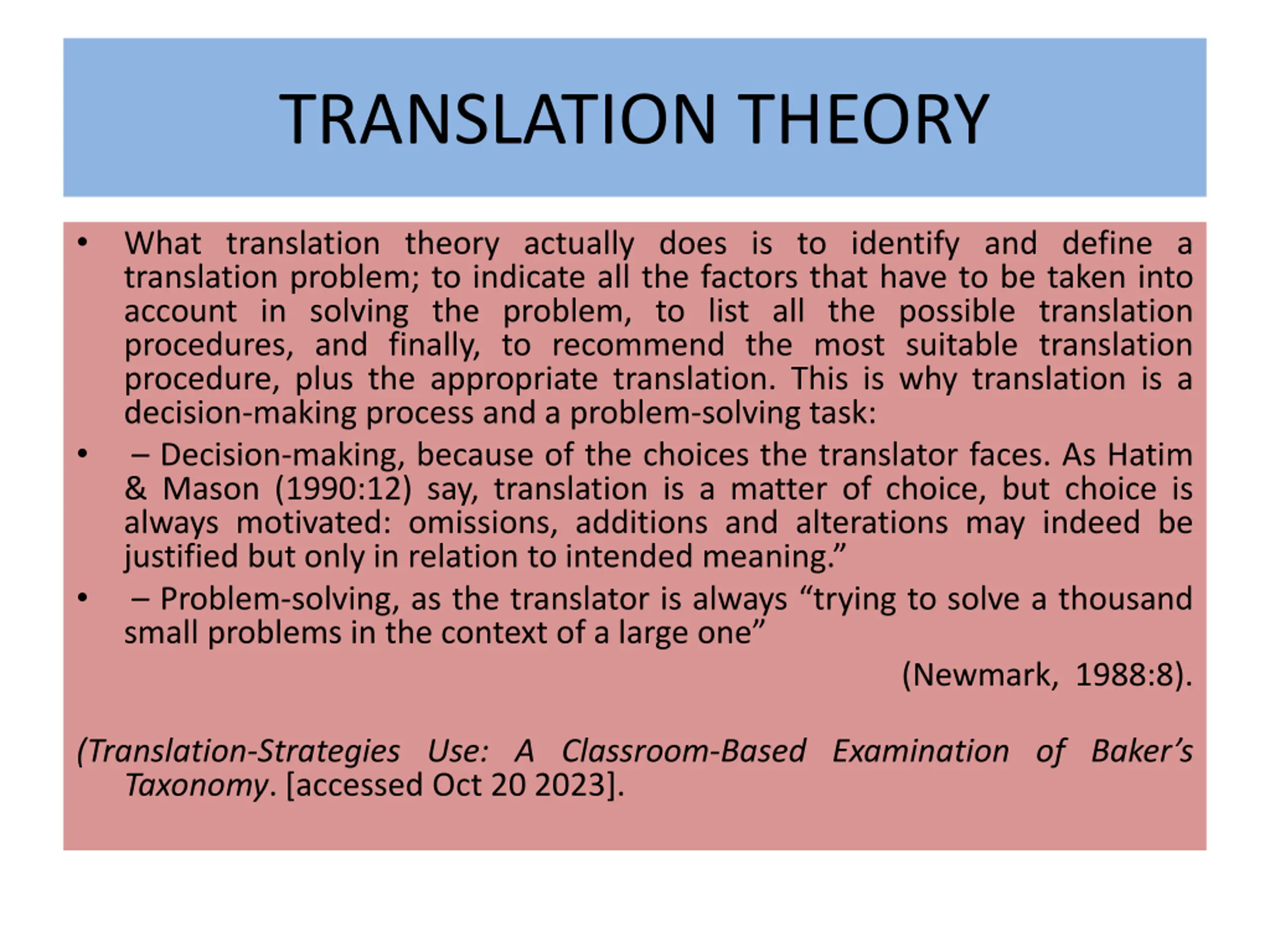 TRANSLATION THEORY What translation theory actually does is to identify and define a translation problem; to indicate all the factors that have to be taken into account in solving the problem, to list all the possible translation procedures, and finally, to recommend the most suitable translation procedure, plus the appropriate translation. This is why translation is a decision-making process and a problem-solving task: Decision-making, because of the choices the translator faces. As Hatim & Mason (1990:12) say, translation is a matter of choice, but choice is always motivated: omissions, additions and alterations may indeed be justified but only in relation to intended meaning. Problem-solving, as the translator is always trying to solve a thousand small problems in the context of a large one (Newmark, 1988:8). (Translation-Strategies Use: A Classroom-Based Examination of Baker s Taxonomy. [accessed Oct 20 2023].