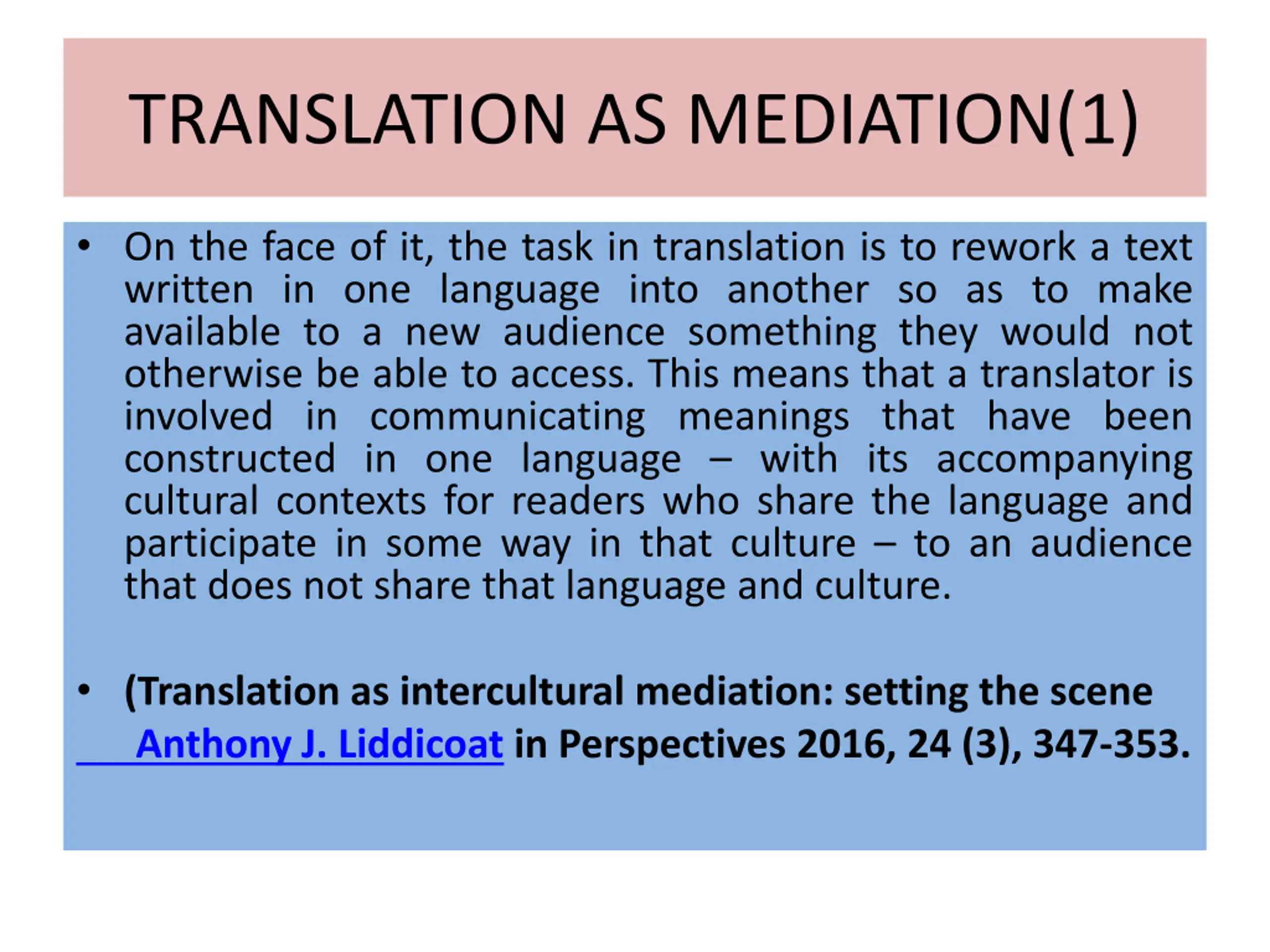 TRANSLATION AS MEDIATION(1) On the face of it, the task in translation is to rework a text written in one language into another so as to make available to a new audience something they would not otherwise be able to access. This means that a translator is involved in communicating meanings that have been constructed in one language with its accompanying cultural contexts for readers who share the language and participate in some way in that culture to an audience that does not share that language and culture. (Translation as intercultural mediation: setting the scene Anthony J. Liddicoat in Perspectives 2016, 24 (3), 347-353.
