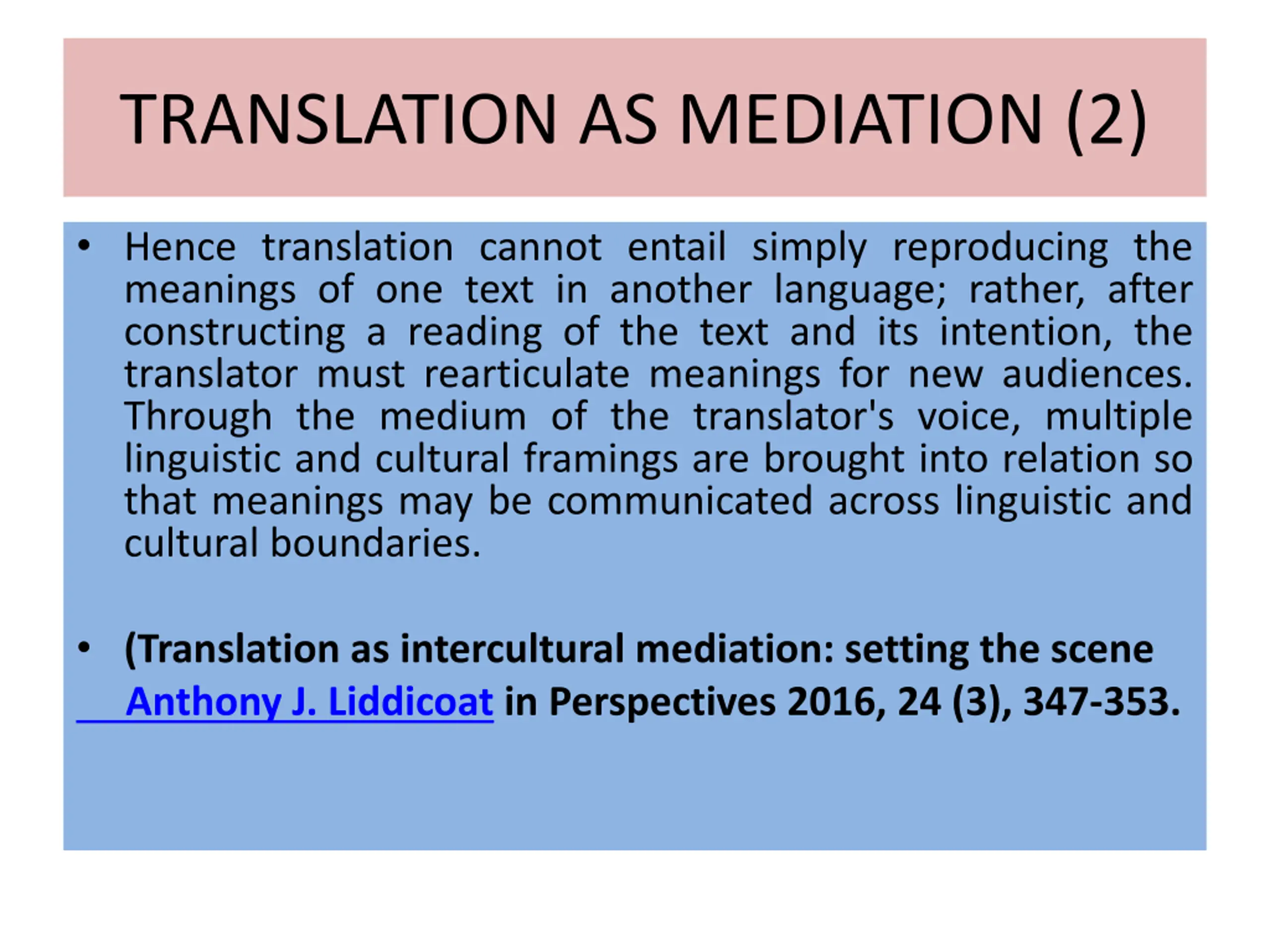 TRANSLATION AS MEDIATION (2) Hence translation cannot entail simply reproducing the meanings of one text in another language; rather, after constructing a reading of the text and its intention, the translator must rearticulate meanings for new audiences. Through the medium of the translator's voice, multiple linguistic and cultural framings are brought into relation so that meanings may be communicated across linguistic and cultural boundaries. (Translation as intercultural mediation: setting the scene Anthony J. Liddicoat in Perspectives 2016, 24 (3), 347-353.