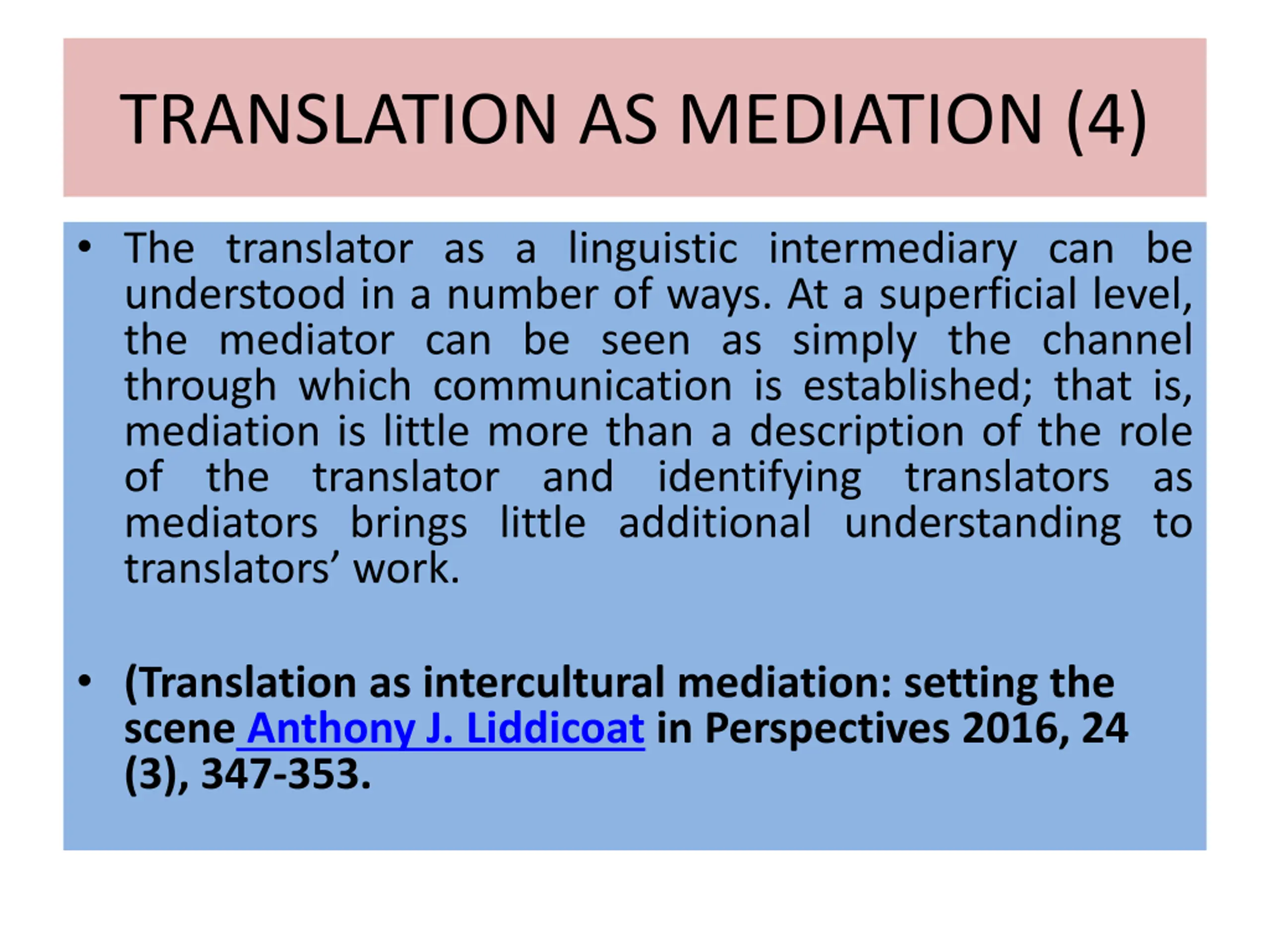 TRANSLATION AS MEDIATION (4) The translator as a linguistic intermediary can be understood in a number of ways. At a superficial level, the mediator can be seen as simply the channel through which communication is established; that is, mediation is little more than a description of the role of the translator and identifying translators as mediators brings little additional understanding to translators work. (Translation as intercultural mediation: setting the scene Anthony J. Liddicoat in Perspectives 2016, 24 (3), 347-353.