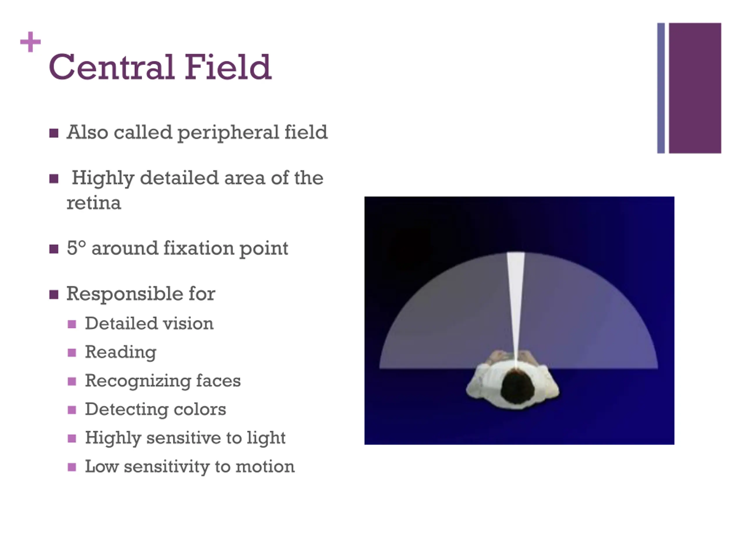 +Central Field Also called peripheral field Highly detailed area of the retina 5 around fixation point Responsible for Detailed vision Reading Recognizing faces Detecting colors Highly sensitive to light Low sensitivity to motion