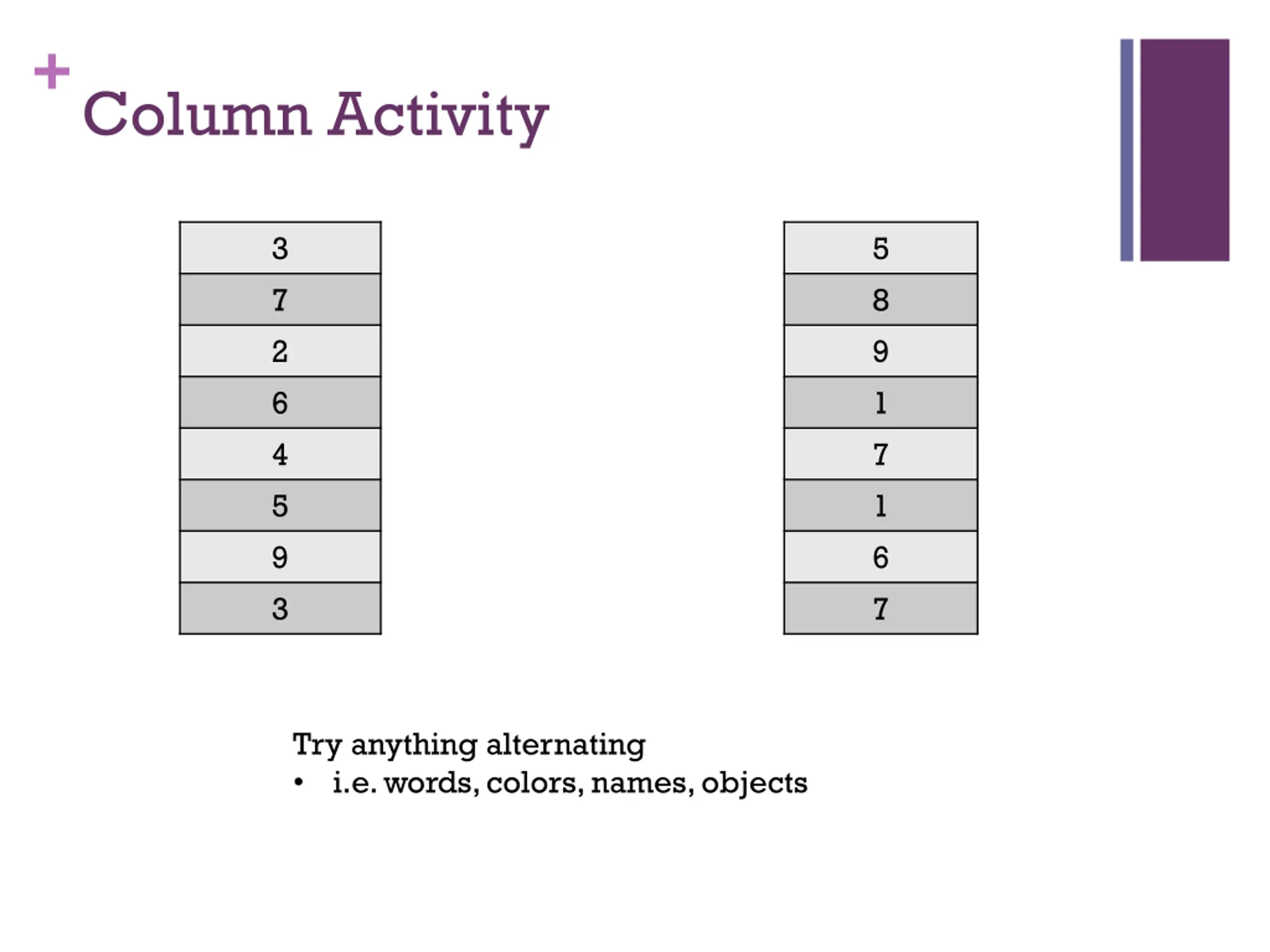 +Column Activity 3 7 2 6 4 5 9 3 5 8 9 1 7 1 6 7 Try anything alternating i.e. words, colors, names, objects