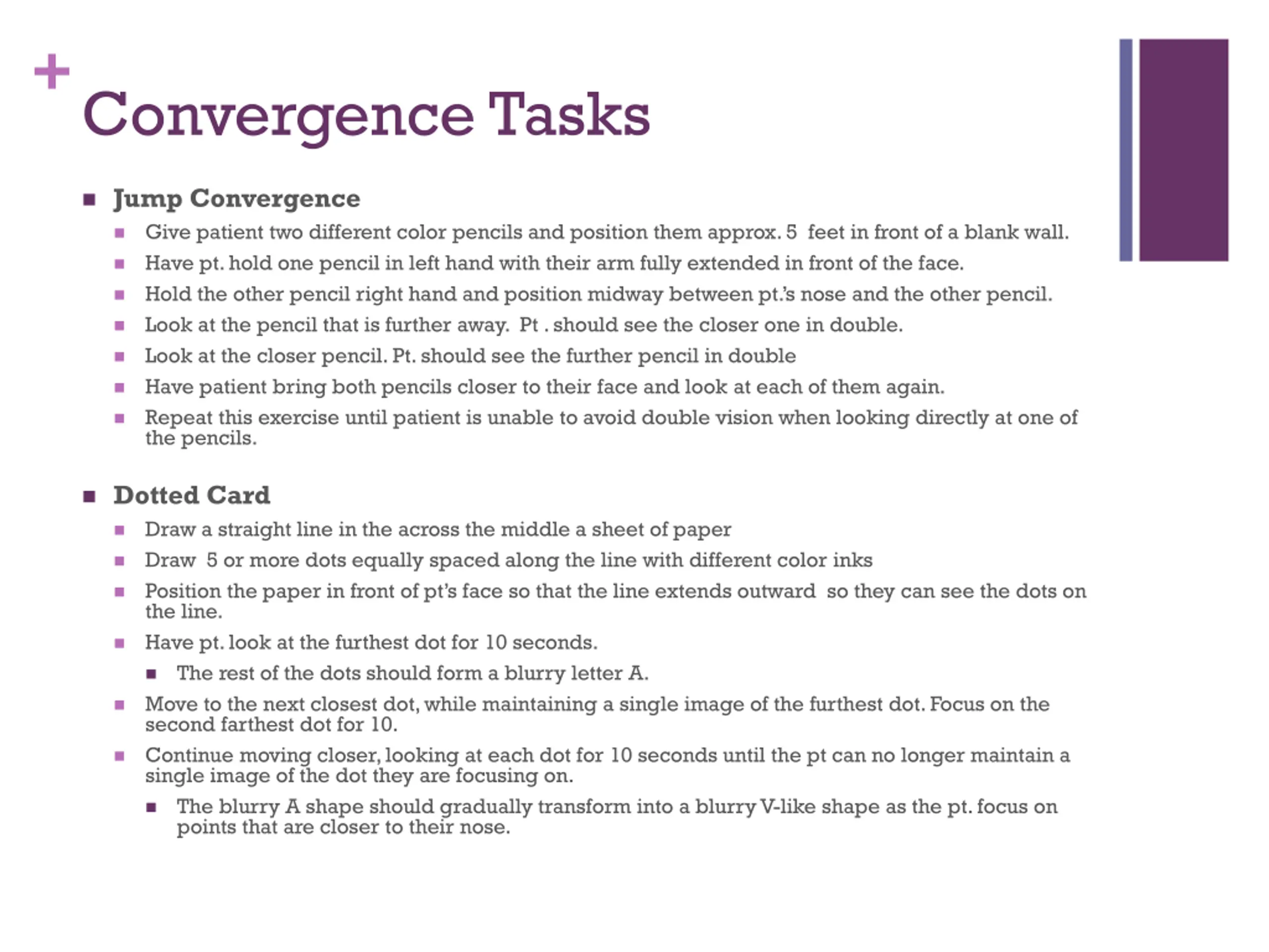 +Convergence Tasks Jump Convergence Give patient two different color pencils and position them approx. 5 feet in front of a blank wall. Have pt. hold one pencil in left hand with their arm fully extended in front of the face. Hold the other pencil right hand and position midway between pt. s nose and the other pencil. Look at the pencil that is further away. Pt . should see the closer one in double. Look at the closer pencil. Pt. should see the further pencil in double Have patient bring both pencils closer to their face and look at each of them again. Repeat this exercise until patient is unable to avoid double vision when looking directly at one of the pencils. Dotted Card Draw a straight line in the across the middle a sheet of paper Draw 5 or more dots equally spaced along the line with different color inks Position the paper in front of pt s face so that the line extends outward so they can see the dots on the line. Have pt. look at the furthest dot for 10 seconds. The rest of the dots should form a blurry letter A. Move to the next closest dot, while maintaining a single image of the furthest dot. Focus on the second farthest dot for 10. Continue moving closer, looking at each dot for 10 seconds until the pt can no longer maintain a single image of the dot they are focusing on. The blurry A shape should gradually transform into a blurry V-like shape as the pt. focus on points that are closer to their nose.