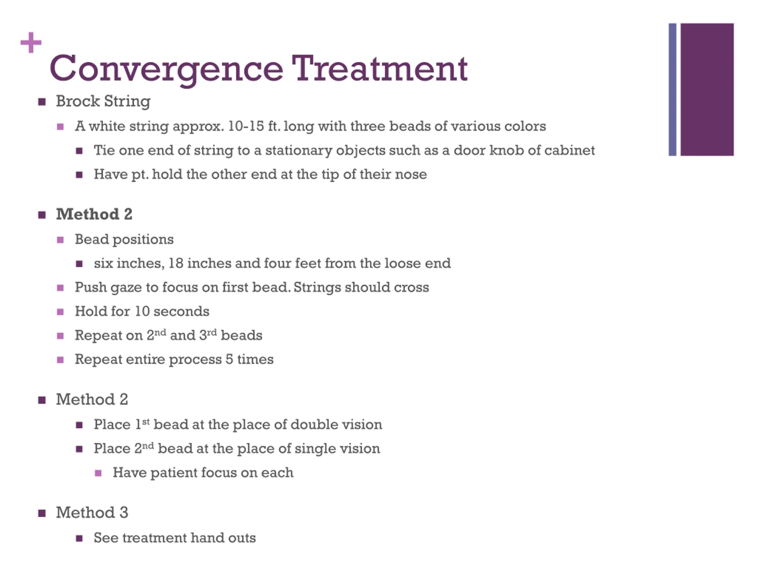 +Convergence Treatment Brock String A white string approx. 10-15 ft. long with three beads of various colors Tie one end of string to a stationary objects such as a door knob of cabinet Have pt. hold the other end at the tip of their nose Method 2 Bead positions six inches, 18 inches and four feet from the loose end Push gaze to focus on first bead. Strings should cross Hold for 10 seconds Repeat on 2nd and 3rd beads Repeat entire process 5 times Method 2 Place 1st bead at the place of double vision Place 2nd bead at the place of single vision Have patient focus on each Method 3 See treatment hand outs