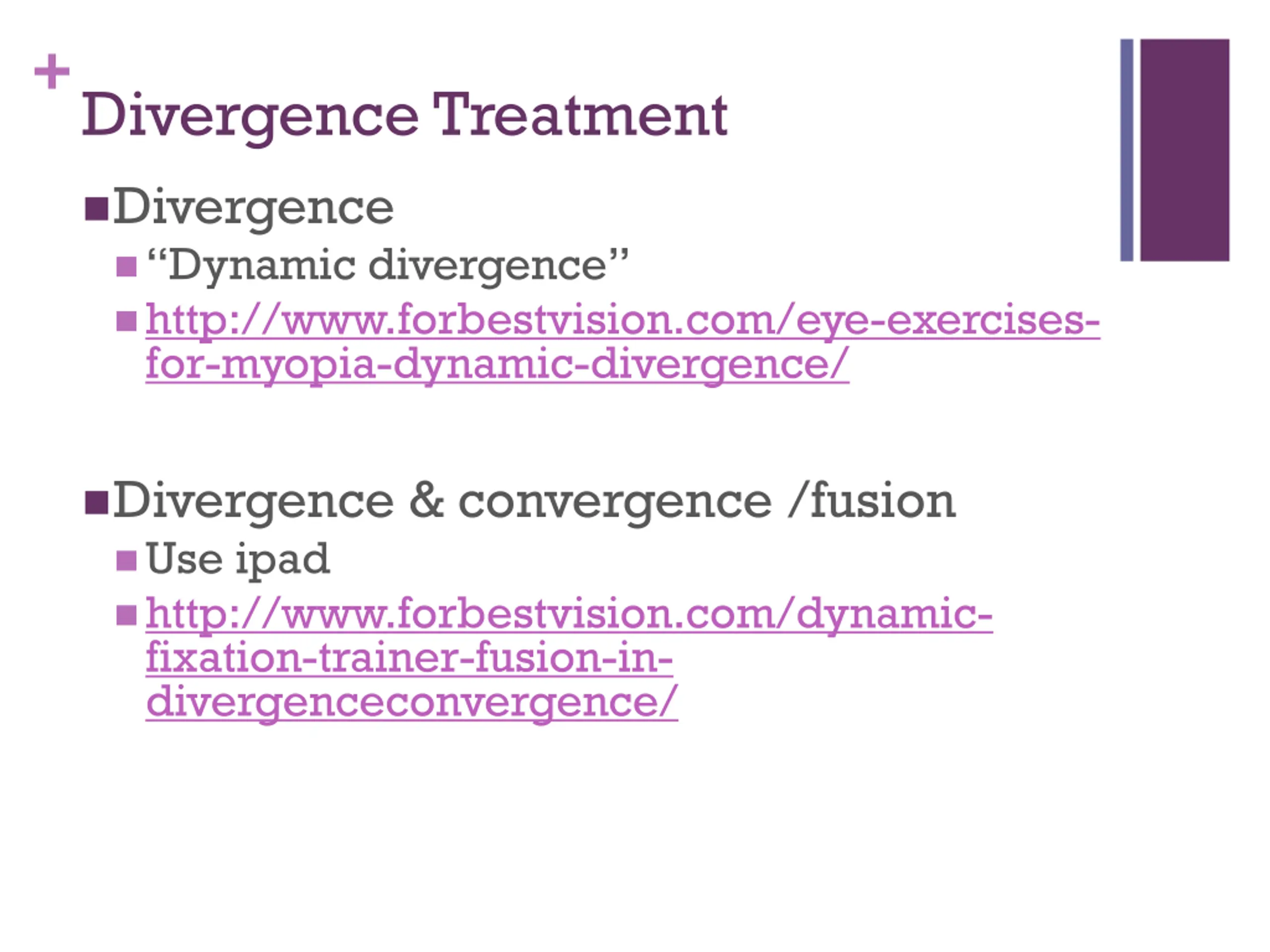 +Divergence Treatment Divergence Dynamic divergence http://www.forbestvision.com/eye-exercises- for-myopia-dynamic-divergence/ Divergence & convergence /fusion Use ipad http://www.forbestvision.com/dynamic- fixation-trainer-fusion-in- divergenceconvergence/