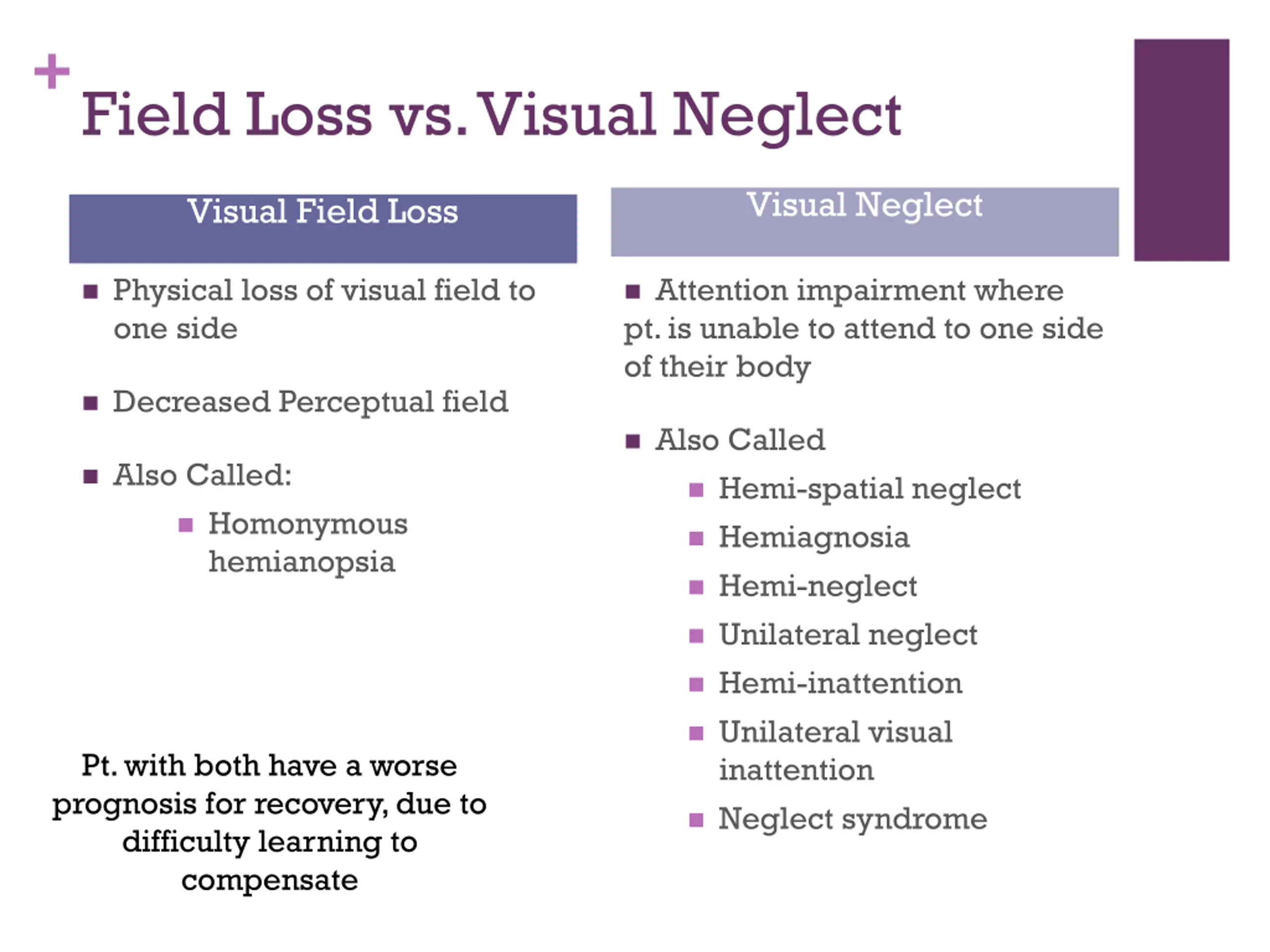 +Field Loss vs. Visual Neglect Visual Neglect Visual Field Loss Physical loss of visual field to one side Attention impairment where pt. is unable to attend to one side of their body Decreased Perceptual field Also Called Hemi-spatial neglect Hemiagnosia Hemi-neglect Unilateral neglect Hemi-inattention Unilateral visual inattention Neglect syndrome Also Called: Homonymous hemianopsia Pt. with both have a worse prognosis for recovery, due to difficulty learning to compensate
