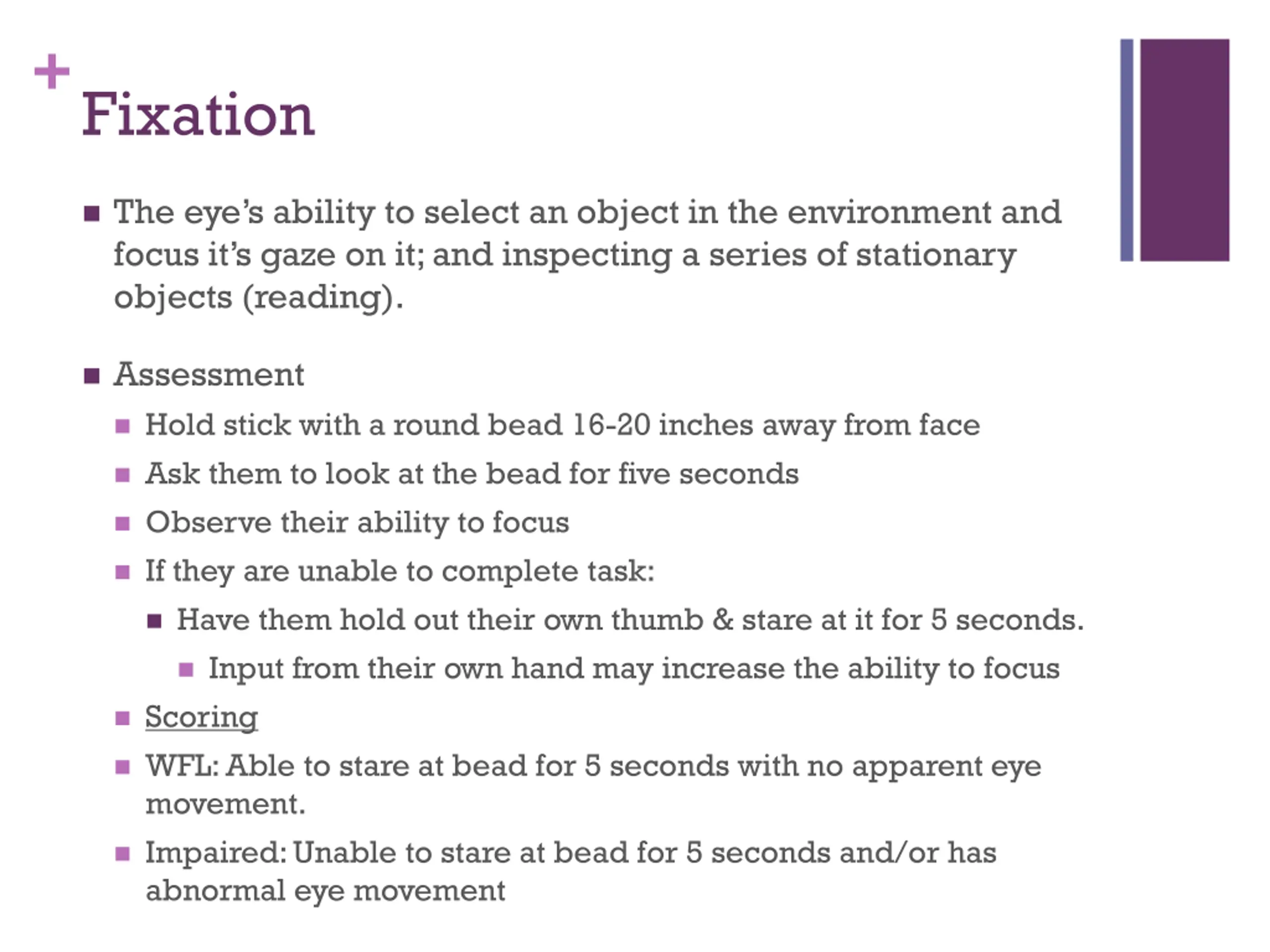 +Fixation The eye s ability to select an object in the environment and focus it s gaze on it; and inspecting a series of stationary objects (reading). Assessment Hold stick with a round bead 16-20 inches away from face Ask them to look at the bead for five seconds Observe their ability to focus If they are unable to complete task: Have them hold out their own thumb & stare at it for 5 seconds. Input from their own hand may increase the ability to focus Scoring WFL: Able to stare at bead for 5 seconds with no apparent eye movement. Impaired: Unable to stare at bead for 5 seconds and/or has abnormal eye movement
