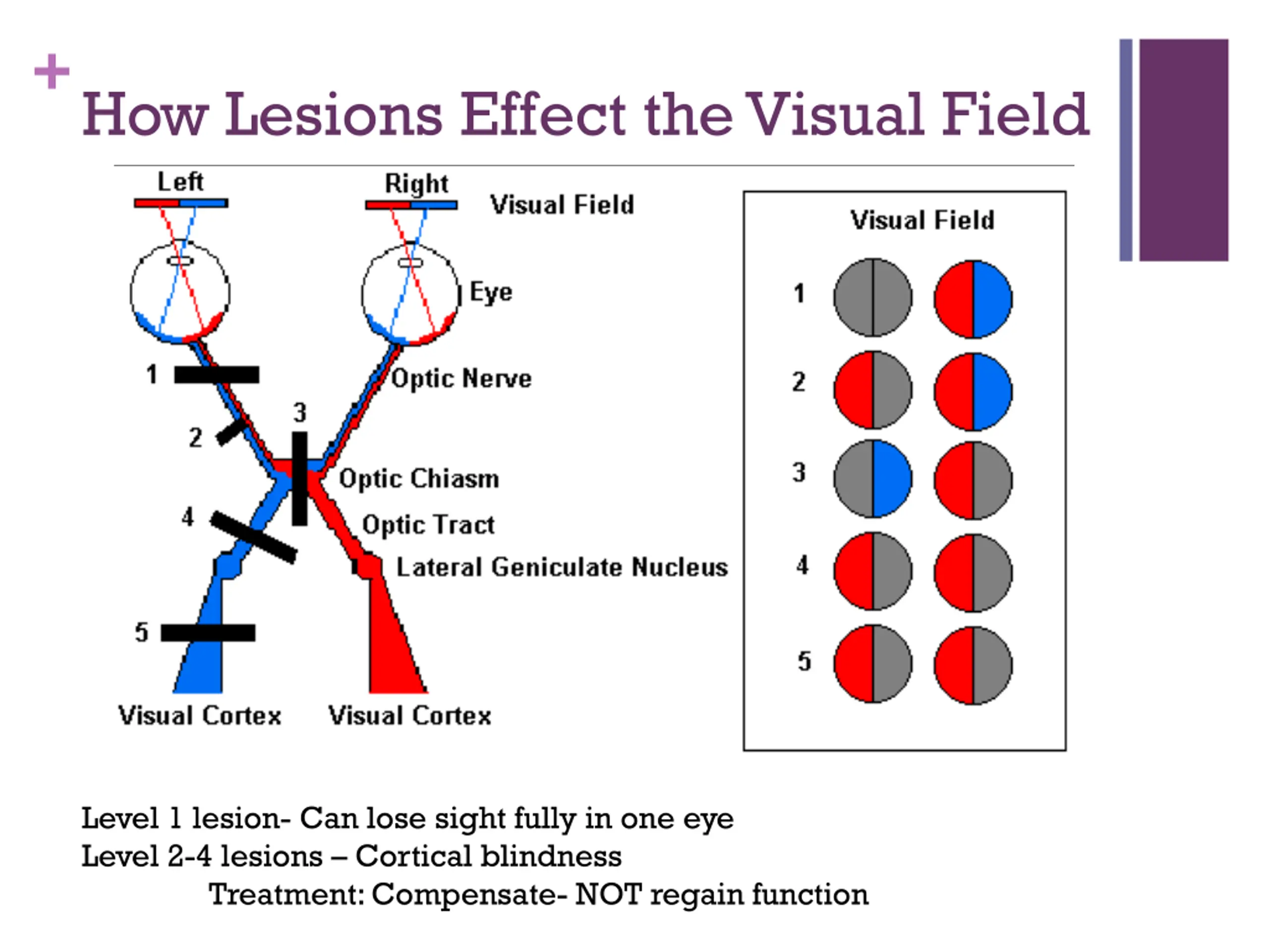 +How Lesions Effect the Visual Field Level 1 lesion- Can lose sight fully in one eye Level 2-4 lesions Cortical blindness Treatment: Compensate- NOT regain function