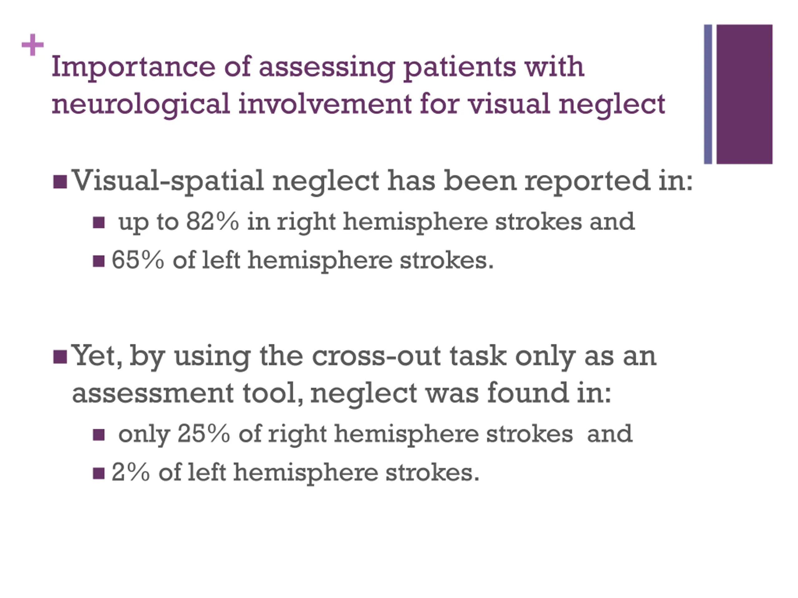 +Importance of assessing patients with neurological involvement for visual neglect Visual-spatial neglect has been reported in: up to 82% in right hemisphere strokes and 65% of left hemisphere strokes. Yet, by using the cross-out task only as an assessment tool, neglect was found in: only 25% of right hemisphere strokes and 2% of left hemisphere strokes.