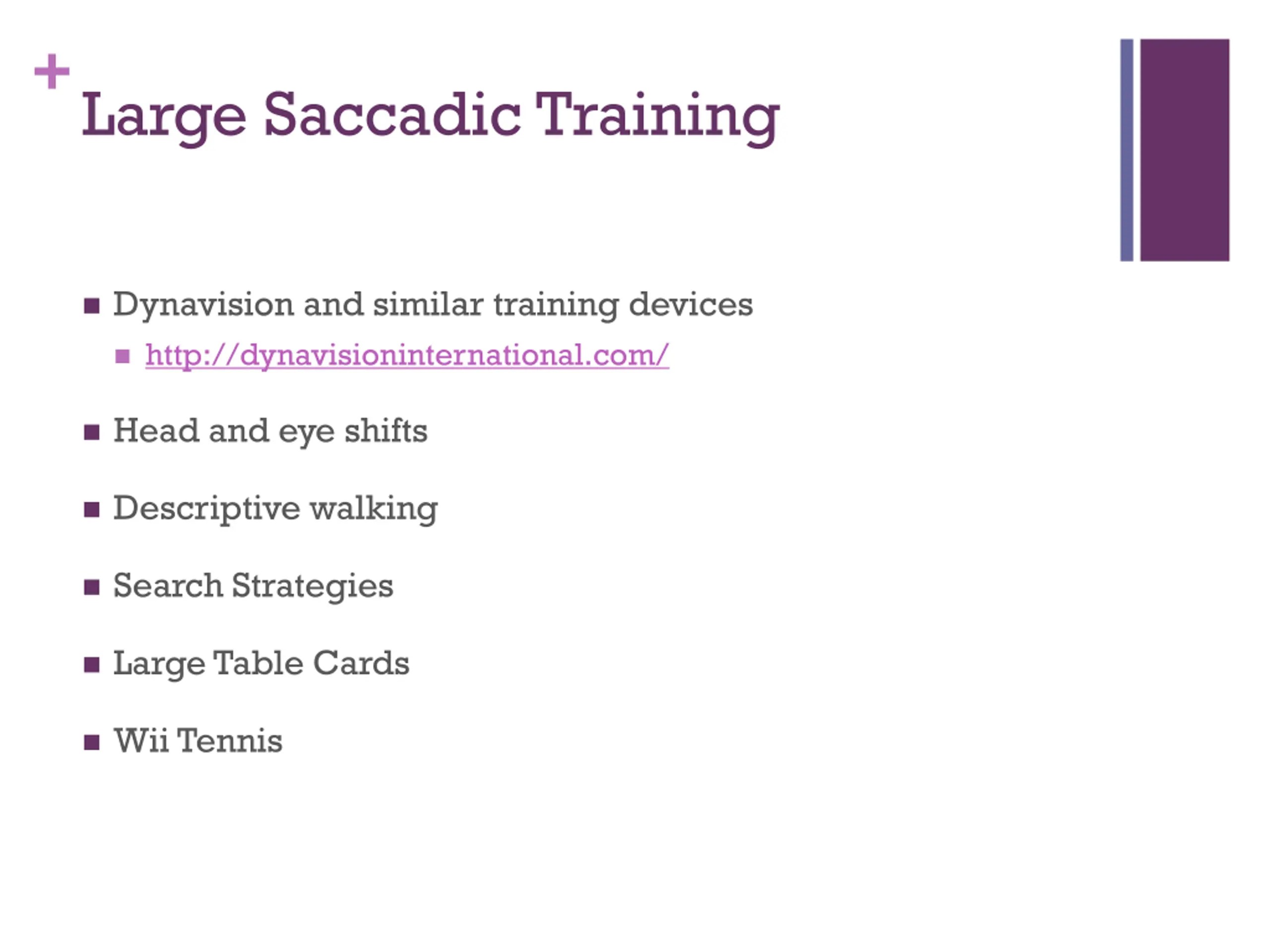 +Large Saccadic Training Dynavision and similar training devices http://dynavisioninternational.com/ Head and eye shifts Descriptive walking Search Strategies Large Table Cards Wii Tennis