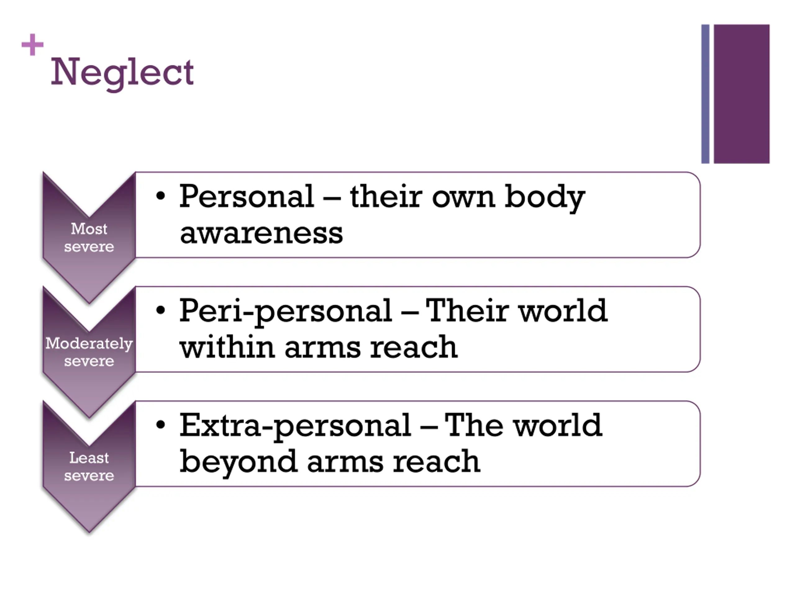 +Neglect Personal their own body awareness Most severe Peri-personal Their world within arms reach Moderately severe Extra-personal The world beyond arms reach Least severe