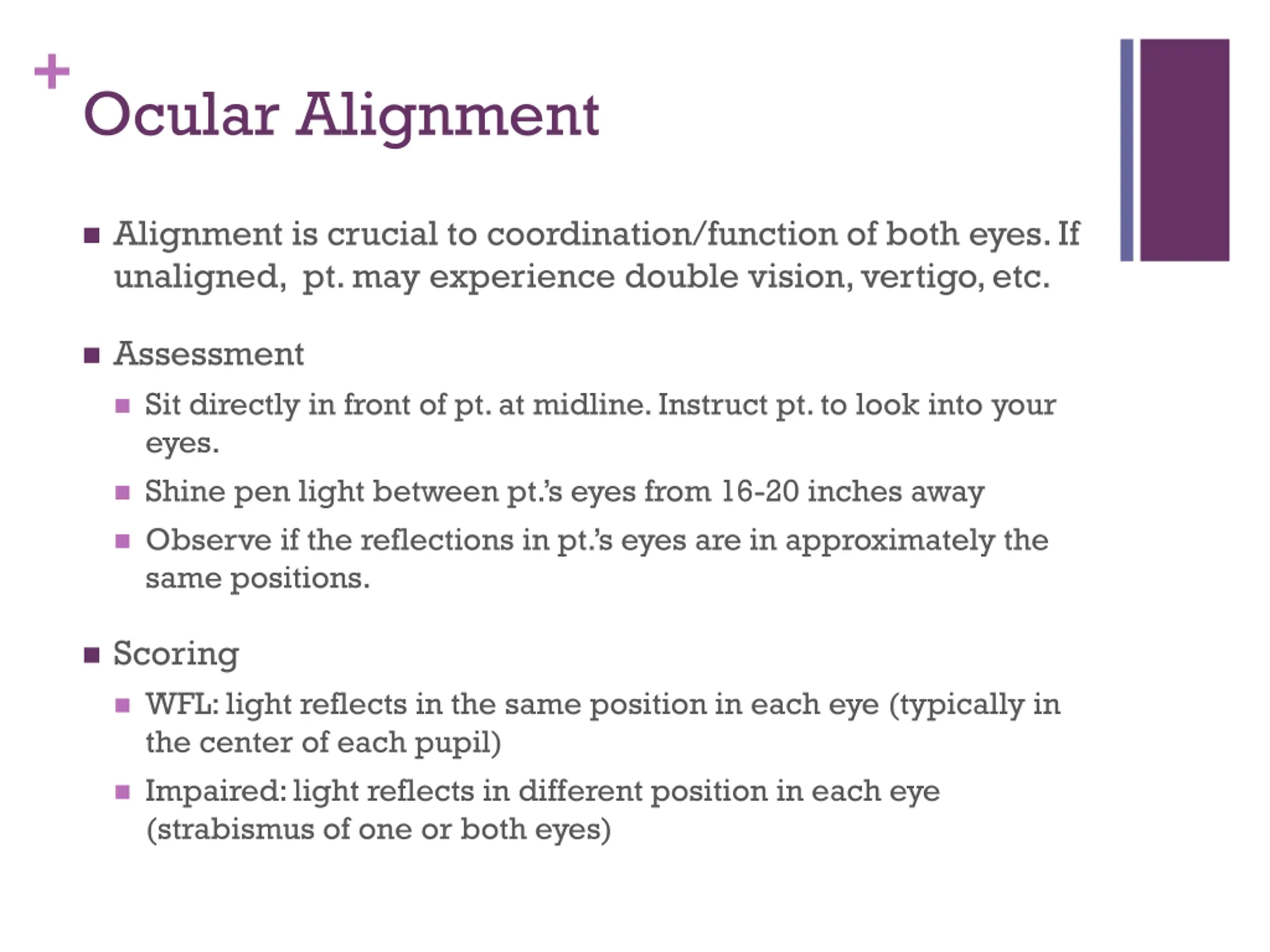 +Ocular Alignment Alignment is crucial to coordination/function of both eyes. If unaligned, pt. may experience double vision, vertigo, etc. Assessment Sit directly in front of pt. at midline. Instruct pt. to look into your eyes. Shine pen light between pt. s eyes from 16-20 inches away Observe if the reflections in pt. s eyes are in approximately the same positions. Scoring WFL: light reflects in the same position in each eye (typically in the center of each pupil) Impaired: light reflects in different position in each eye (strabismus of one or both eyes)