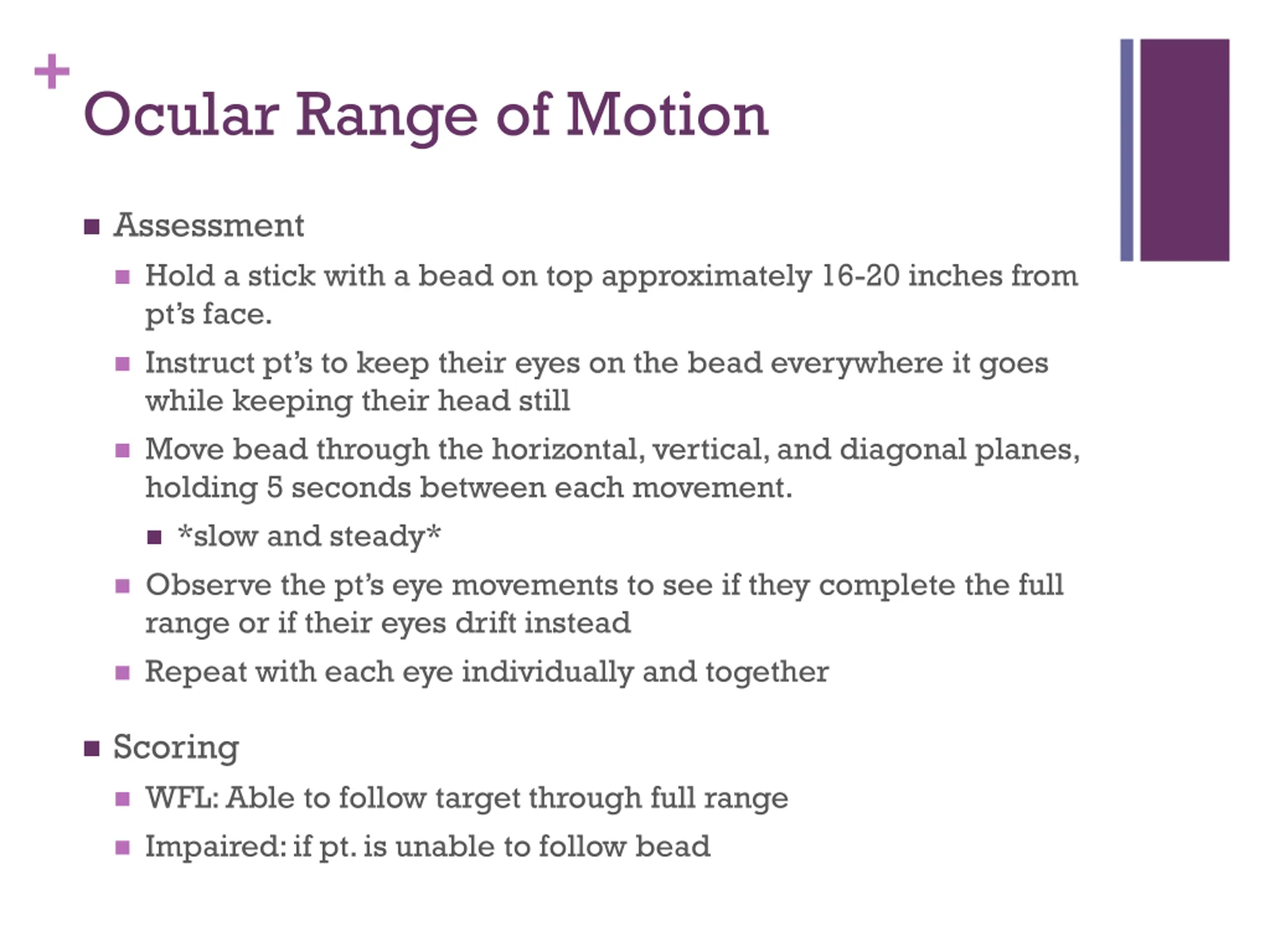 +Ocular Range of Motion Assessment Hold a stick with a bead on top approximately 16-20 inches from pt s face. Instruct pt s to keep their eyes on the bead everywhere it goes while keeping their head still Move bead through the horizontal, vertical, and diagonal planes, holding 5 seconds between each movement. *slow and steady* Observe the pt s eye movements to see if they complete the full range or if their eyes drift instead Repeat with each eye individually and together Scoring WFL: Able to follow target through full range Impaired: if pt. is unable to follow bead