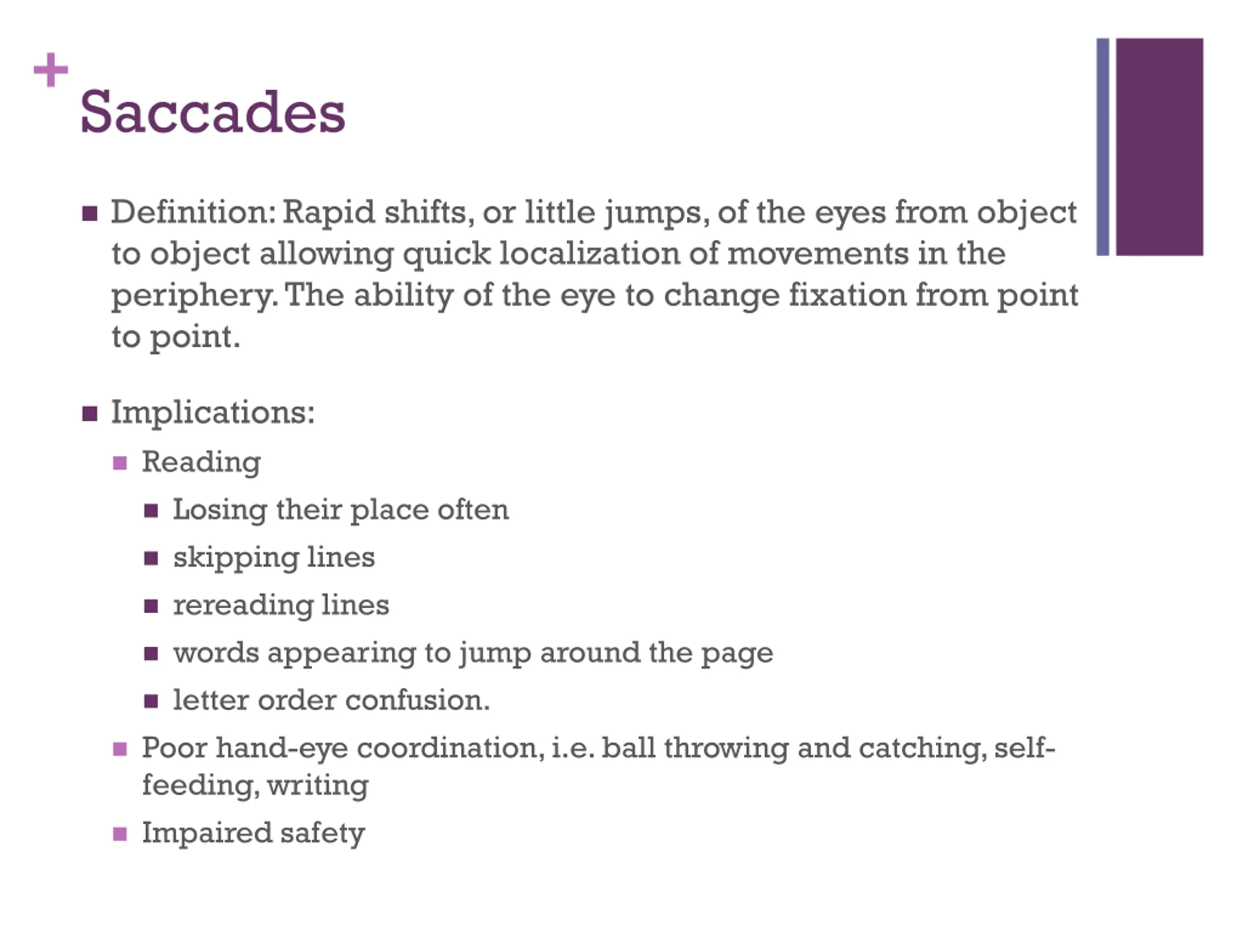 +Saccades Definition: Rapid shifts, or little jumps, of the eyes from object to object allowing quick localization of movements in the periphery. The ability of the eye to change fixation from point to point. Implications: Reading Losing their place often skipping lines rereading lines words appearing to jump around the page letter order confusion. Poor hand-eye coordination, i.e. ball throwing and catching, self- feeding, writing Impaired safety