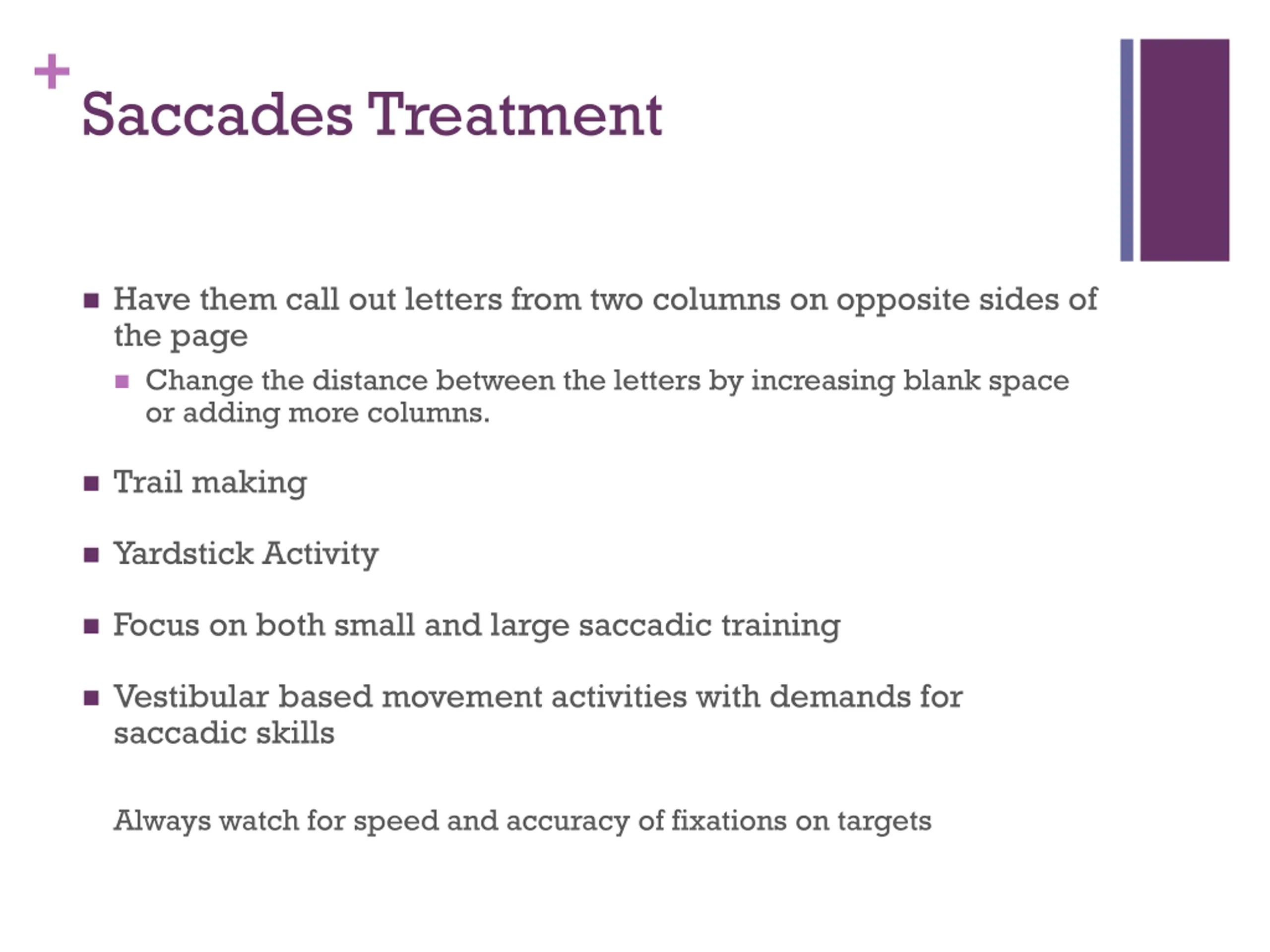 +Saccades Treatment Have them call out letters from two columns on opposite sides of the page Change the distance between the letters by increasing blank space or adding more columns. Trail making Yardstick Activity Focus on both small and large saccadic training Vestibular based movement activities with demands for saccadic skills Always watch for speed and accuracy of fixations on targets