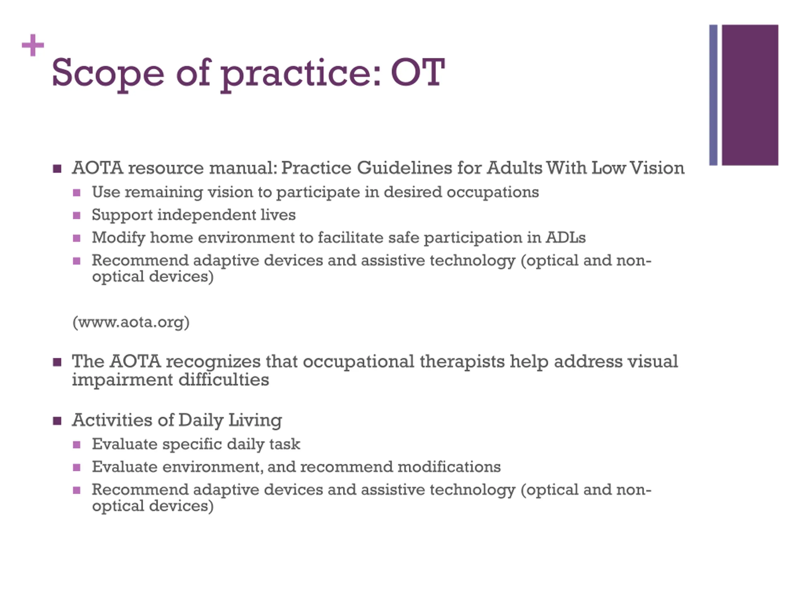 +Scope of practice: OT AOTA resource manual: Practice Guidelines for Adults With Low Vision Use remaining vision to participate in desired occupations Support independent lives Modify home environment to facilitate safe participation in ADLs Recommend adaptive devices and assistive technology (optical and non- optical devices) (www.aota.org) The AOTA recognizes that occupational therapists help address visual impairment difficulties Activities of Daily Living Evaluate specific daily task Evaluate environment, and recommend modifications Recommend adaptive devices and assistive technology (optical and non- optical devices)