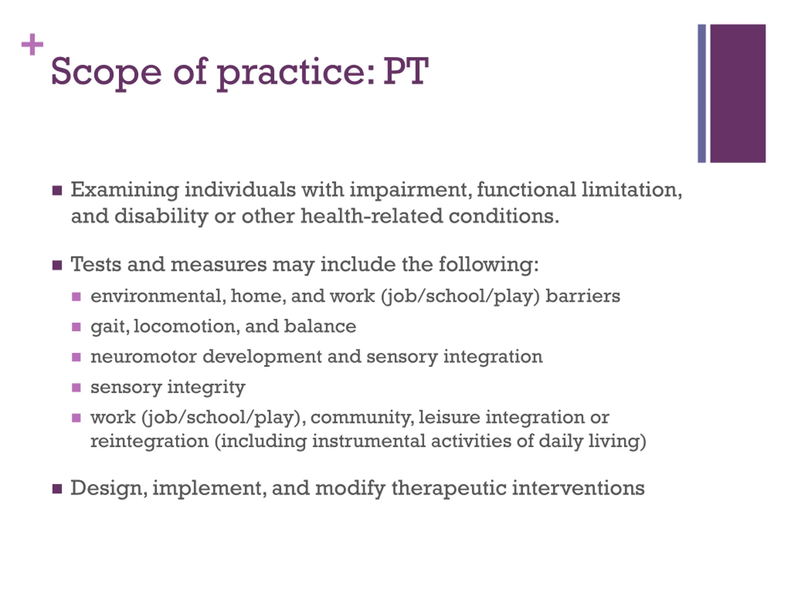 +Scope of practice: PT Examining individuals with impairment, functional limitation, and disability or other health-related conditions. Tests and measures may include the following: environmental, home, and work (job/school/play) barriers gait, locomotion, and balance neuromotor development and sensory integration sensory integrity work (job/school/play), community, leisure integration or reintegration (including instrumental activities of daily living) Design, implement, and modify therapeutic interventions