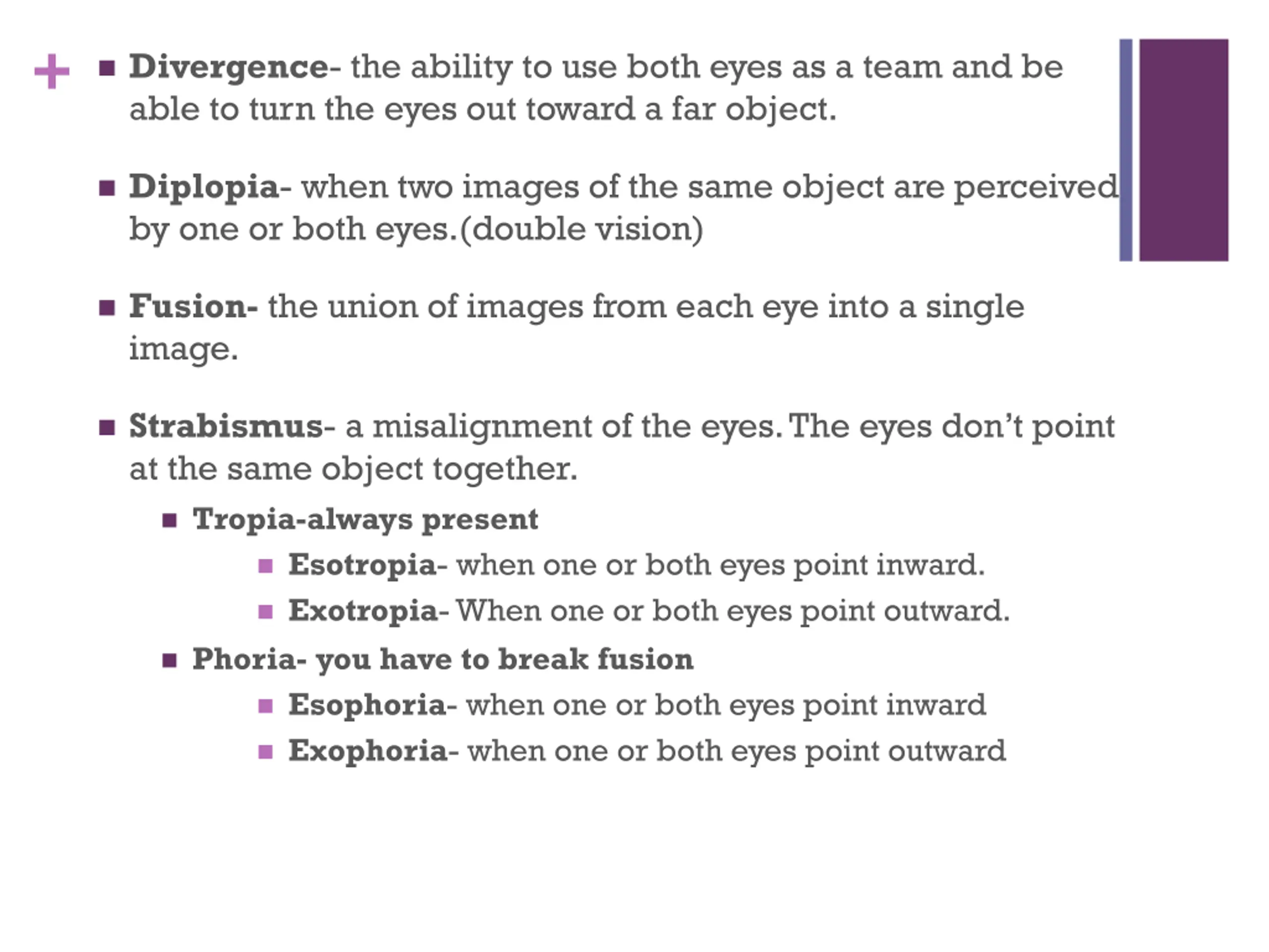 + Divergence- the ability to use both eyes as a team and be able to turn the eyes out toward a far object. Diplopia- when two images of the same object are perceived by one or both eyes.(double vision) Fusion- the union of images from each eye into a single image. Strabismus- a misalignment of the eyes. The eyes don t point at the same object together. Tropia-always present Esotropia- when one or both eyes point inward. Exotropia-When one or both eyes point outward. Phoria- you have to break fusion Esophoria- when one or both eyes point inward Exophoria- when one or both eyes point outward