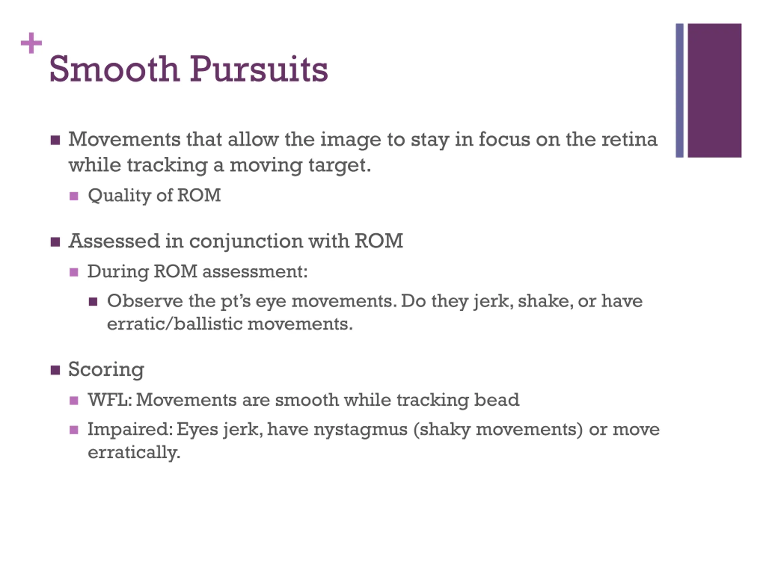 +Smooth Pursuits Movements that allow the image to stay in focus on the retina while tracking a moving target. Quality of ROM Assessed in conjunction with ROM During ROM assessment: Observe the pt s eye movements. Do they jerk, shake, or have erratic/ballistic movements. Scoring WFL: Movements are smooth while tracking bead Impaired: Eyes jerk, have nystagmus (shaky movements) or move erratically.