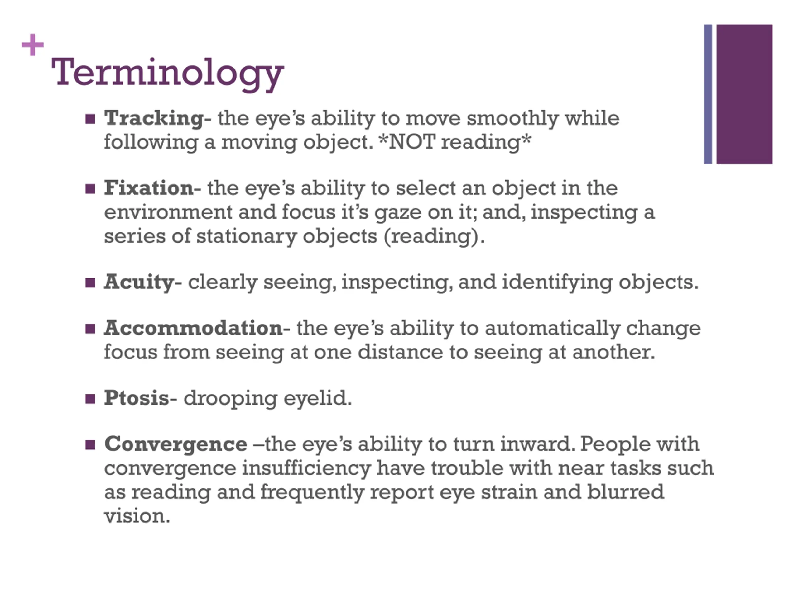 +Terminology Tracking- the eye s ability to move smoothly while following a moving object. *NOT reading* Fixation- the eye s ability to select an object in the environment and focus it s gaze on it; and, inspecting a series of stationary objects (reading). Acuity- clearly seeing, inspecting, and identifying objects. Accommodation- the eye s ability to automatically change focus from seeing at one distance to seeing at another. Ptosis- drooping eyelid. Convergence the eye s ability to turn inward. People with convergence insufficiency have trouble with near tasks such as reading and frequently report eye strain and blurred vision.