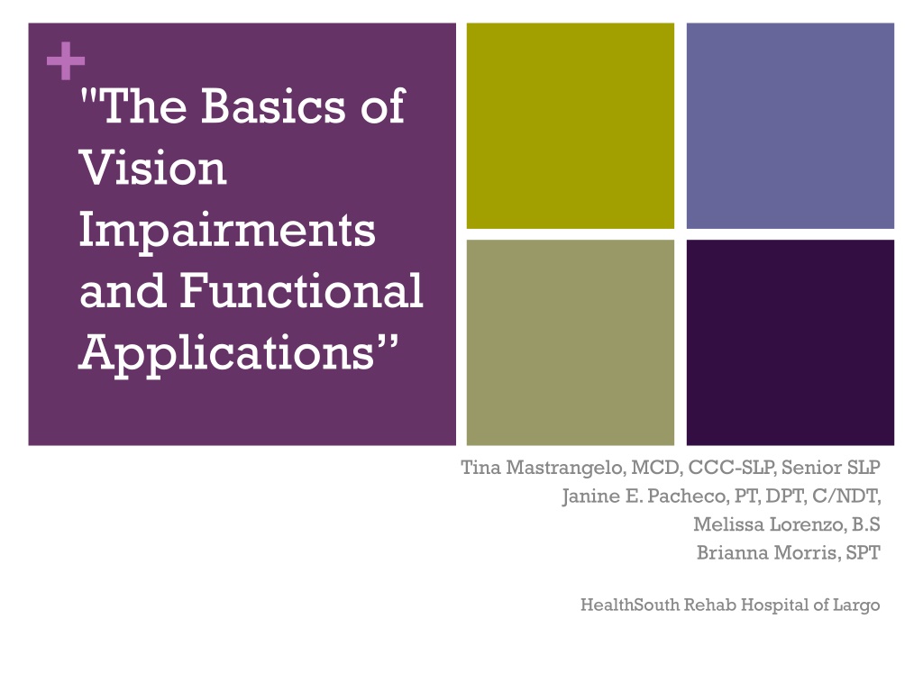 +"The Basics of Vision Impairments and Functional Applications Tina Mastrangelo, MCD, CCC-SLP, Senior SLP Janine E. Pacheco, PT, DPT, C/NDT, Melissa Lorenzo, B.S Brianna Morris, SPT HealthSouth Rehab Hospital of Largo