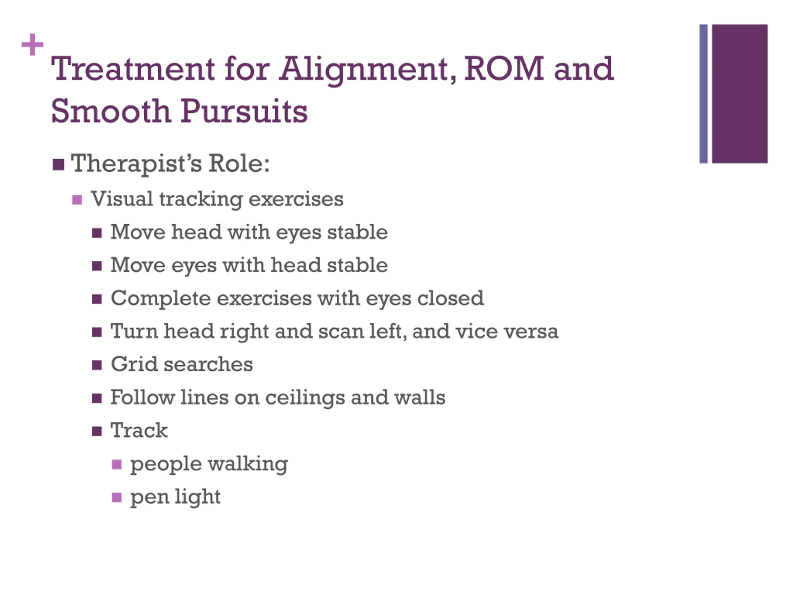 +Treatment for Alignment, ROM and Smooth Pursuits Therapist s Role: Visual tracking exercises Move head with eyes stable Move eyes with head stable Complete exercises with eyes closed Turn head right and scan left, and vice versa Grid searches Follow lines on ceilings and walls Track people walking pen light
