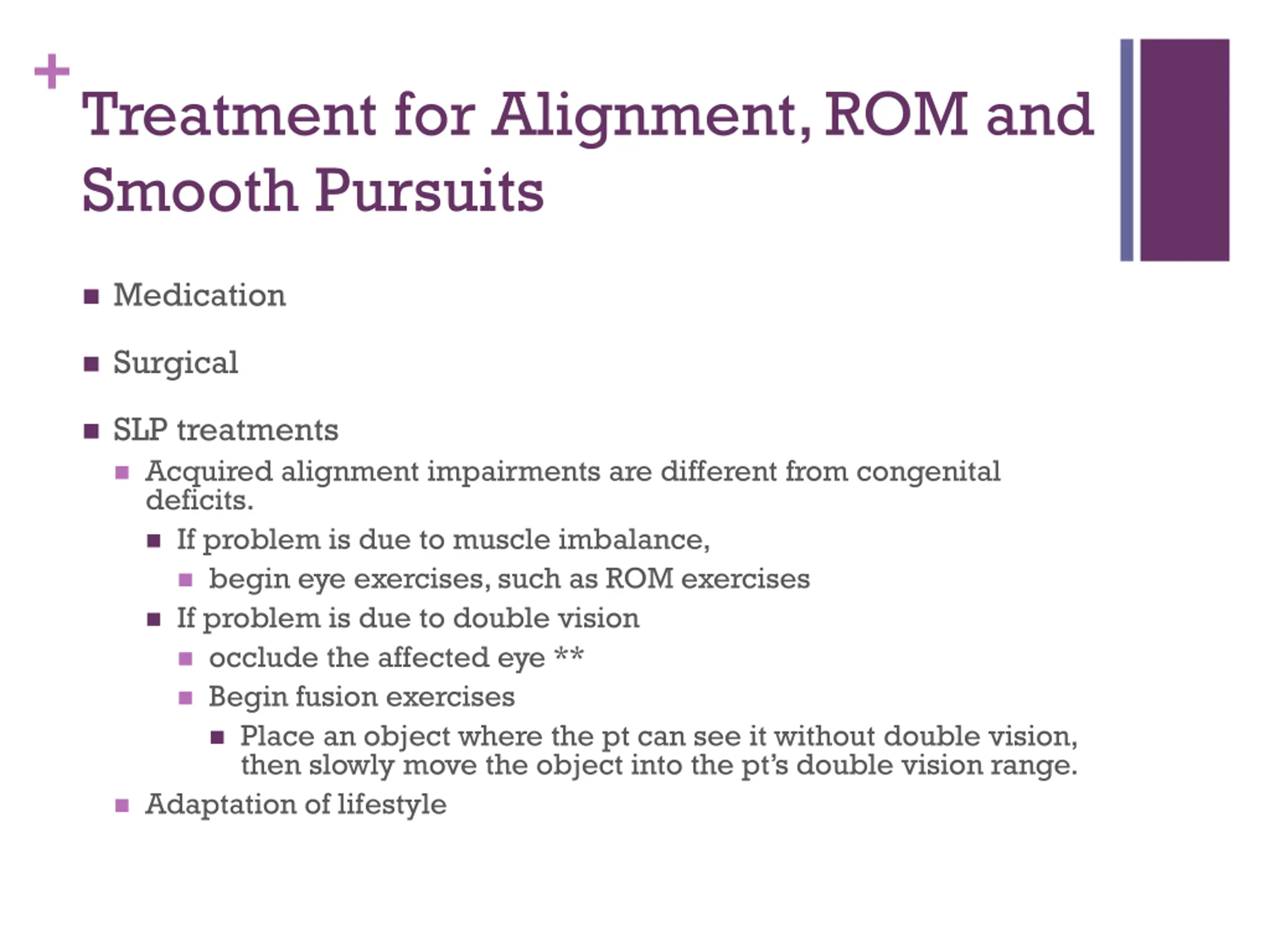 +Treatment for Alignment, ROM and Smooth Pursuits Medication Surgical SLP treatments Acquired alignment impairments are different from congenital deficits. If problem is due to muscle imbalance, begin eye exercises, such as ROM exercises If problem is due to double vision occlude the affected eye ** Begin fusion exercises Place an object where the pt can see it without double vision, then slowly move the object into the pt s double vision range. Adaptation of lifestyle