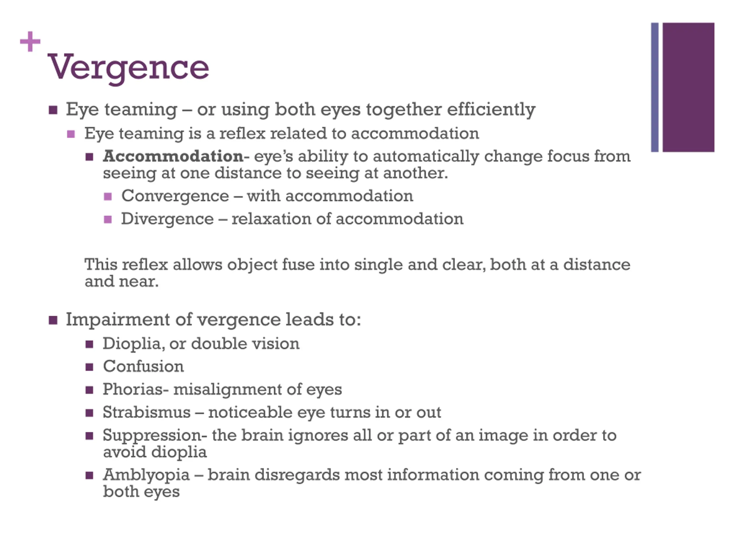 +Vergence Eye teaming or using both eyes together efficiently Eye teaming is a reflex related to accommodation Accommodation- eye s ability to automatically change focus from seeing at one distance to seeing at another. Convergence with accommodation Divergence relaxation of accommodation This reflex allows object fuse into single and clear, both at a distance and near. Impairment of vergence leads to: Dioplia, or double vision Confusion Phorias- misalignment of eyes Strabismus noticeable eye turns in or out Suppression- the brain ignores all or part of an image in order to avoid dioplia Amblyopia brain disregards most information coming from one or both eyes