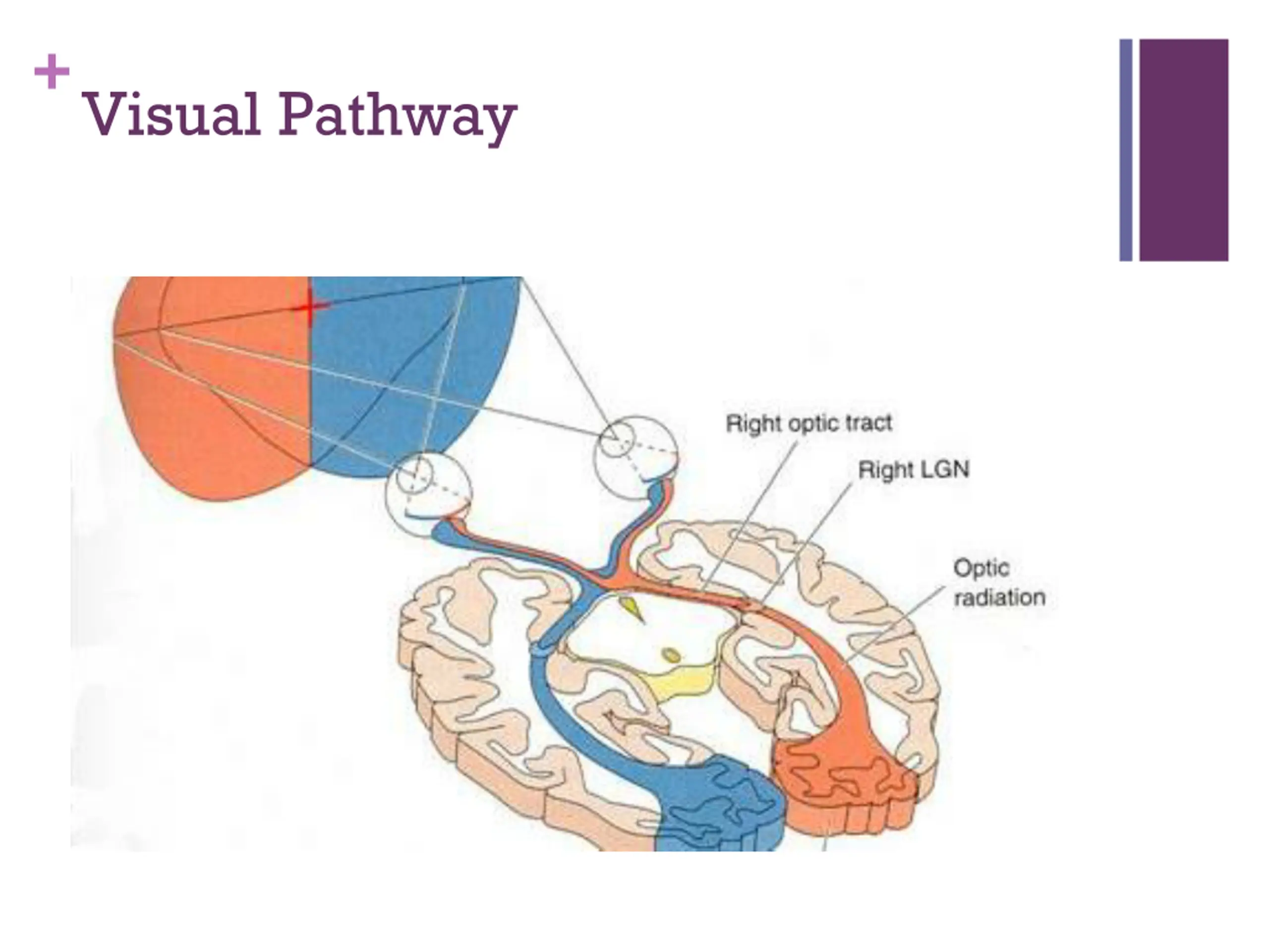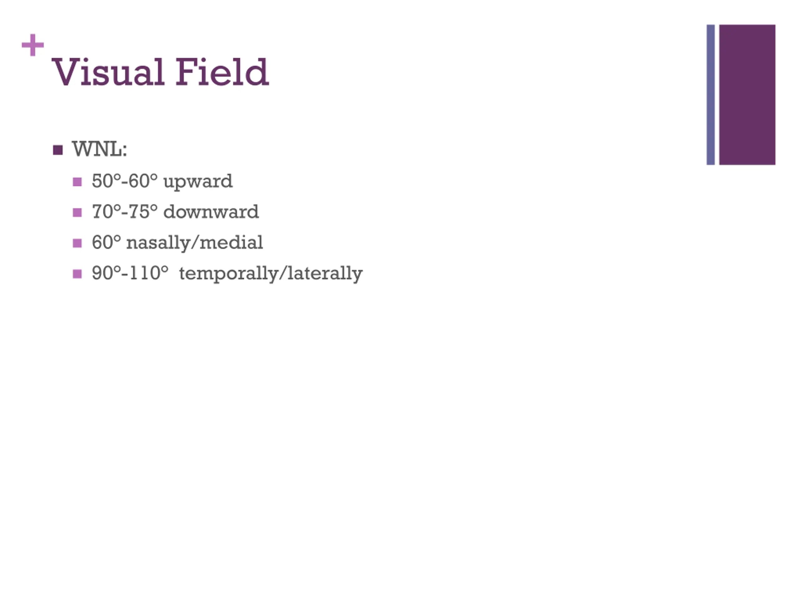 +Visual Field WNL: 50 -60 upward 70 -75 downward 60 nasally/medial 90 -110 temporally/laterally