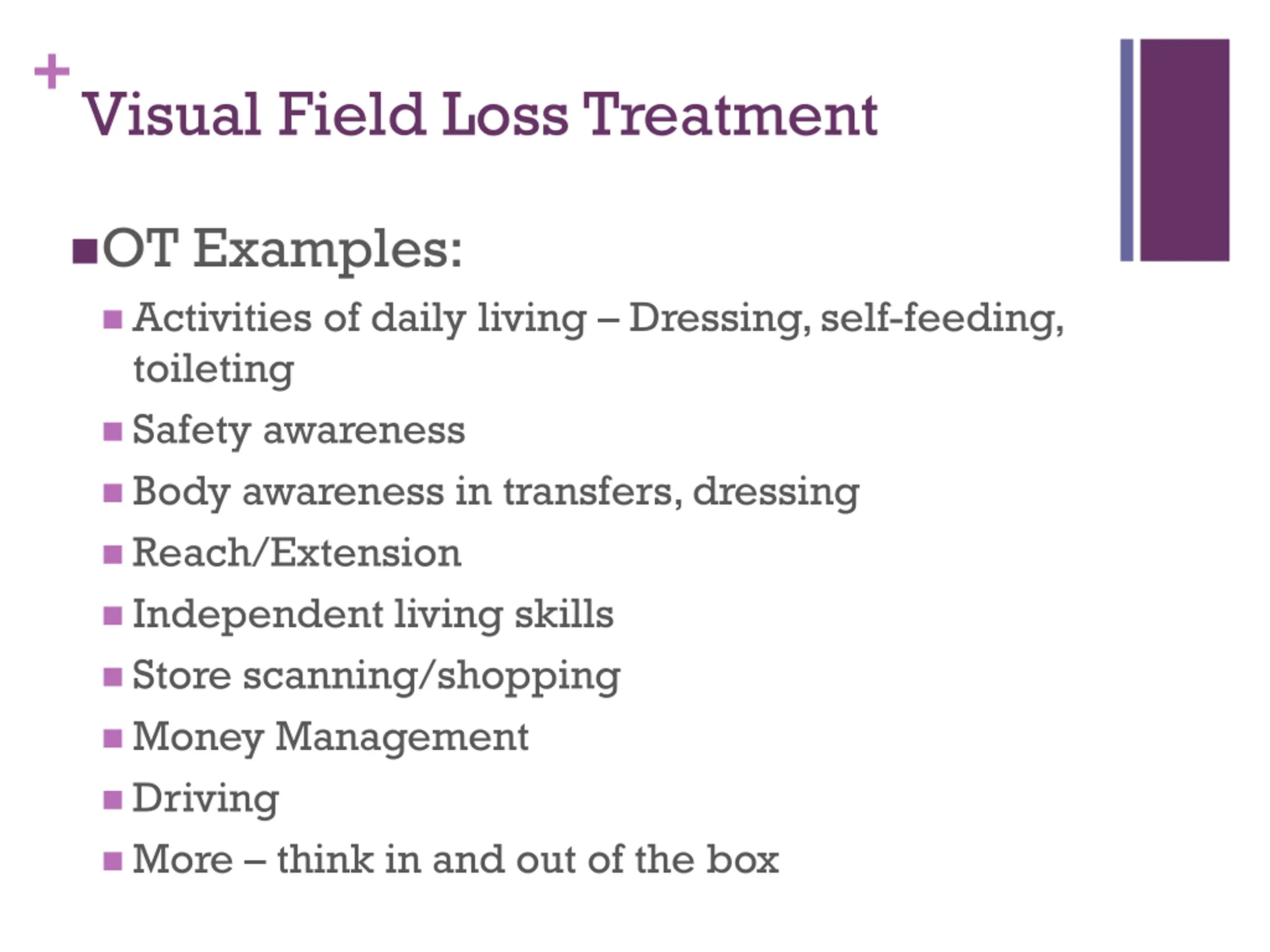 +Visual Field Loss Treatment OT Examples: Activities of daily living Dressing, self-feeding, toileting Safety awareness Body awareness in transfers, dressing Reach/Extension Independent living skills Store scanning/shopping Money Management Driving More think in and out of the box