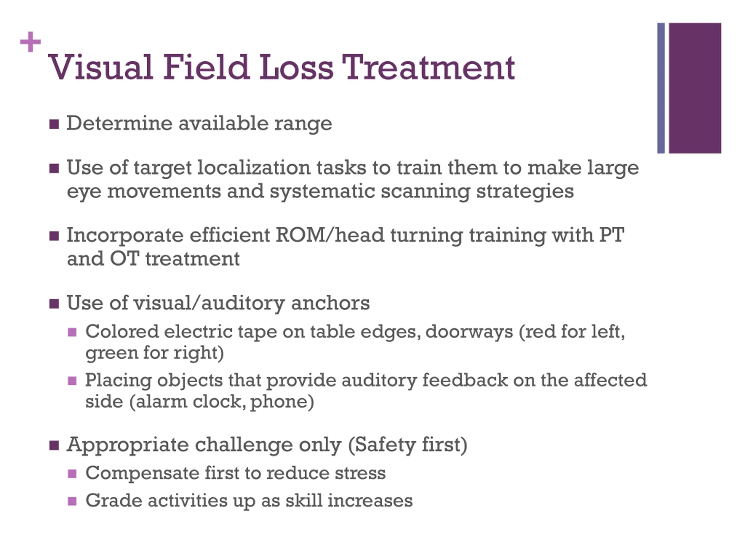 +Visual Field Loss Treatment Determine available range Use of target localization tasks to train them to make large eye movements and systematic scanning strategies Incorporate efficient ROM/head turning training with PT and OT treatment Use of visual/auditory anchors Colored electric tape on table edges, doorways (red for left, green for right) Placing objects that provide auditory feedback on the affected side (alarm clock, phone) Appropriate challenge only (Safety first) Compensate first to reduce stress Grade activities up as skill increases