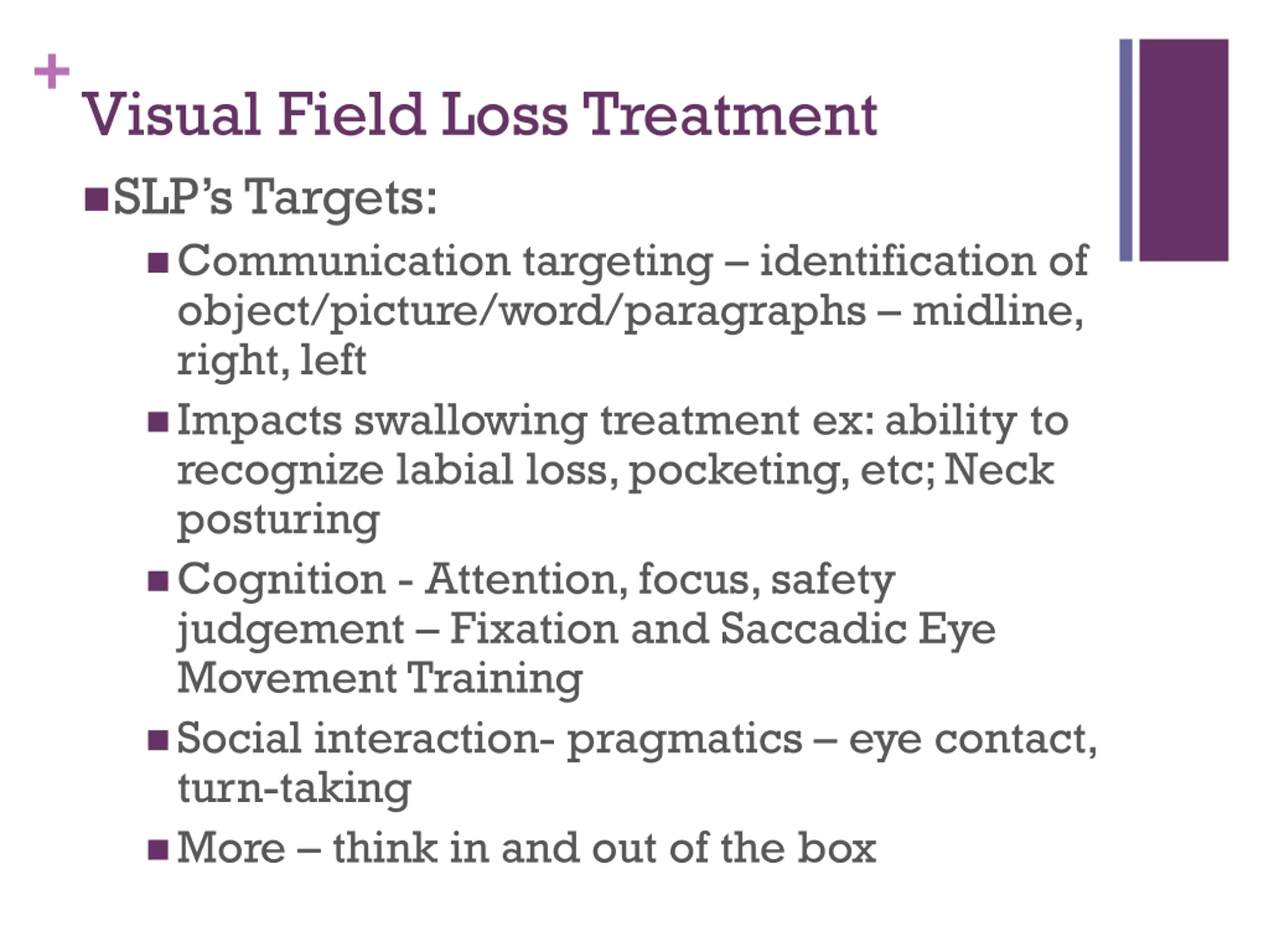 +Visual Field Loss Treatment SLP s Targets: Communication targeting identification of object/picture/word/paragraphs midline, right, left Impacts swallowing treatment ex: ability to recognize labial loss, pocketing, etc; Neck posturing Cognition - Attention, focus, safety judgement Fixation and Saccadic Eye Movement Training Social interaction- pragmatics eye contact, turn-taking More think in and out of the box