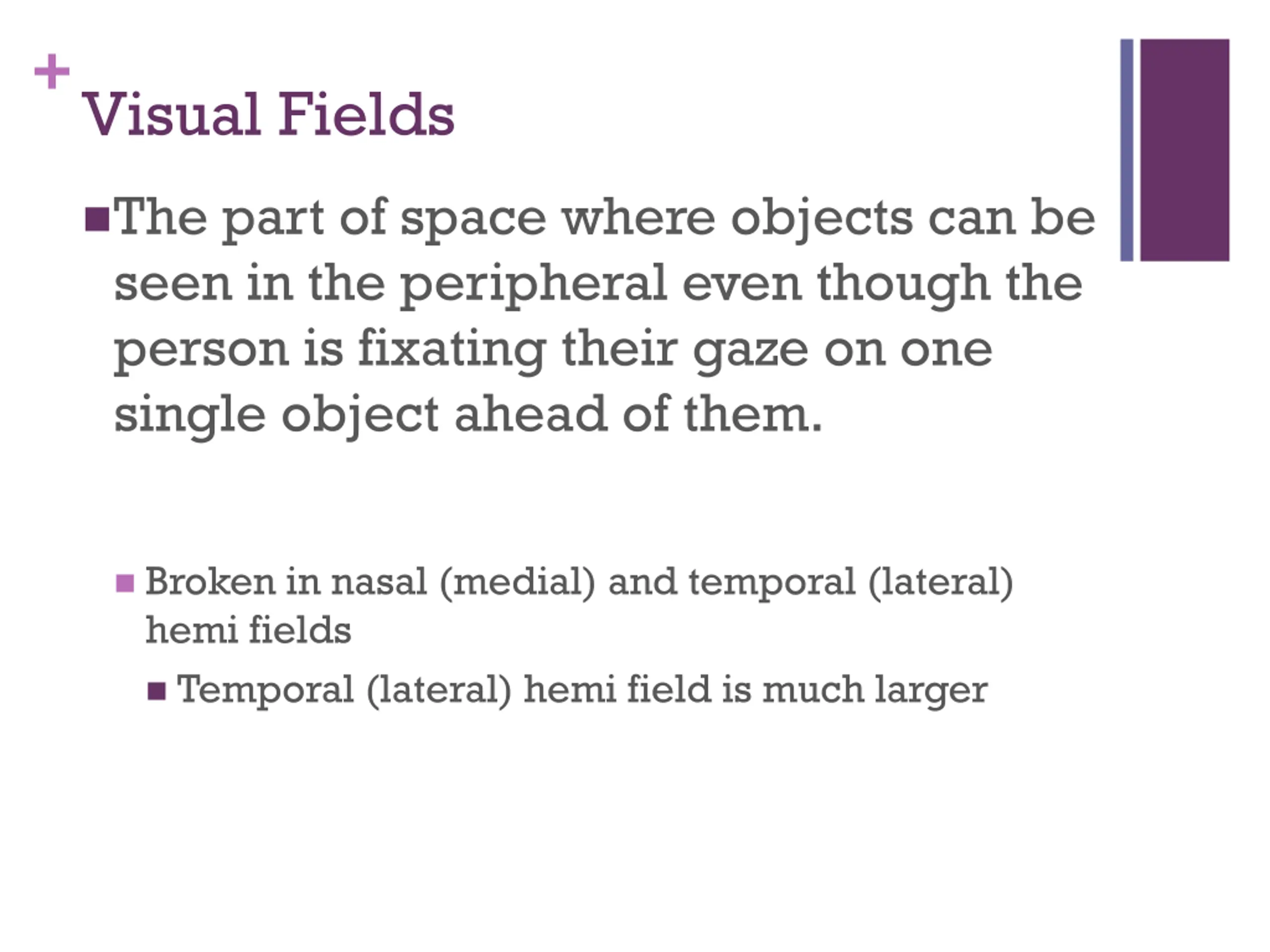 +Visual Fields The part of space where objects can be seen in the peripheral even though the person is fixating their gaze on one single object ahead of them. Broken in nasal (medial) and temporal (lateral) hemi fields Temporal (lateral) hemi field is much larger