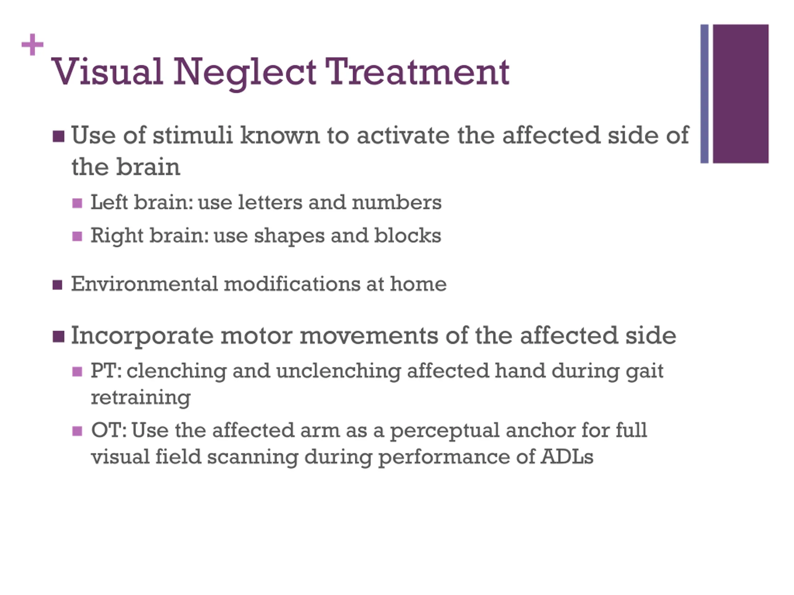 +Visual Neglect Treatment Use of stimuli known to activate the affected side of the brain Left brain: use letters and numbers Right brain: use shapes and blocks Environmental modifications at home Incorporate motor movements of the affected side PT: clenching and unclenching affected hand during gait retraining OT: Use the affected arm as a perceptual anchor for full visual field scanning during performance of ADLs