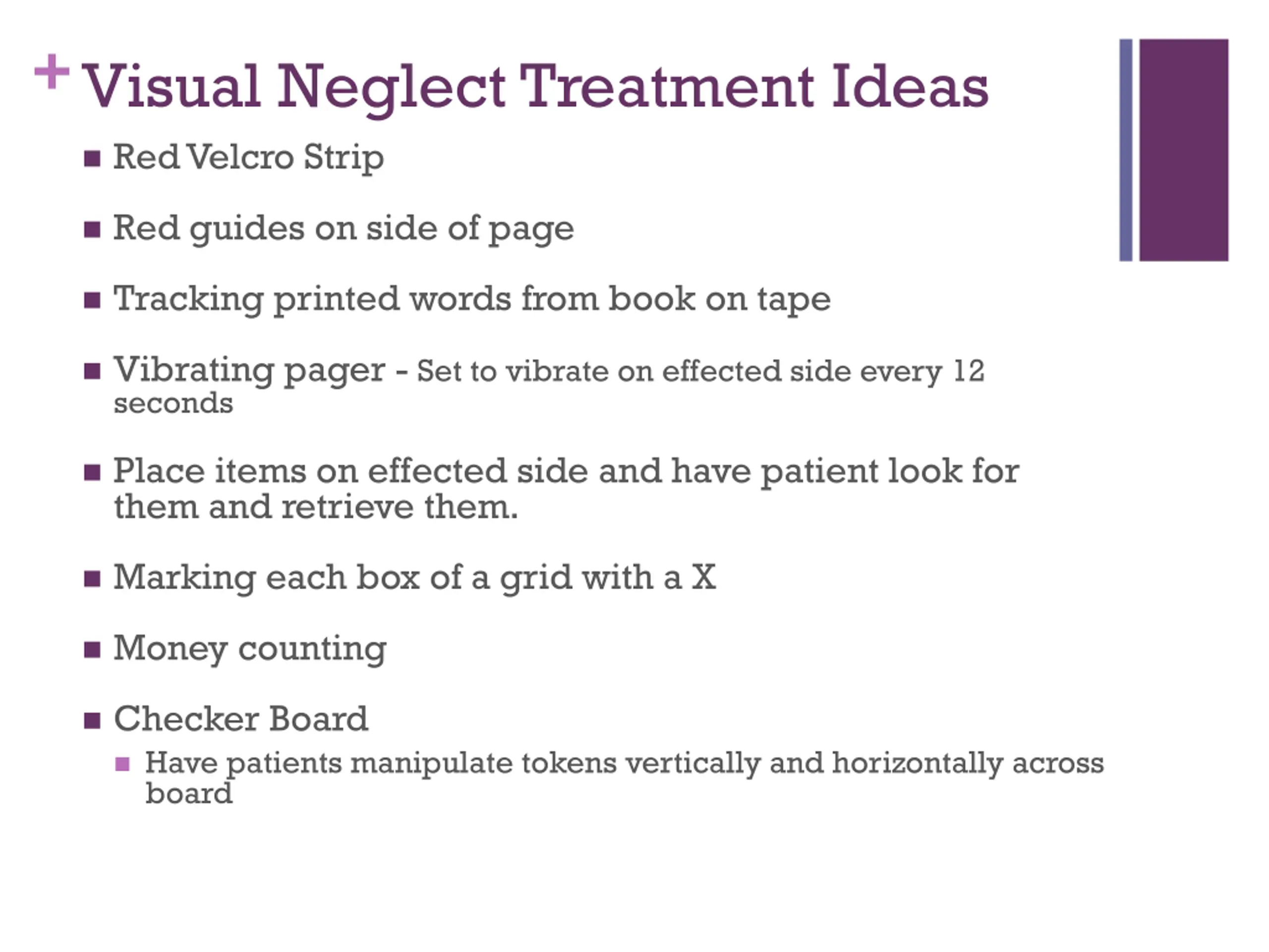 +Visual Neglect Treatment Ideas Red Velcro Strip Red guides on side of page Tracking printed words from book on tape Vibrating pager - Set to vibrate on effected side every 12 seconds Place items on effected side and have patient look for them and retrieve them. Marking each box of a grid with a X Money counting Checker Board Have patients manipulate tokens vertically and horizontally across board