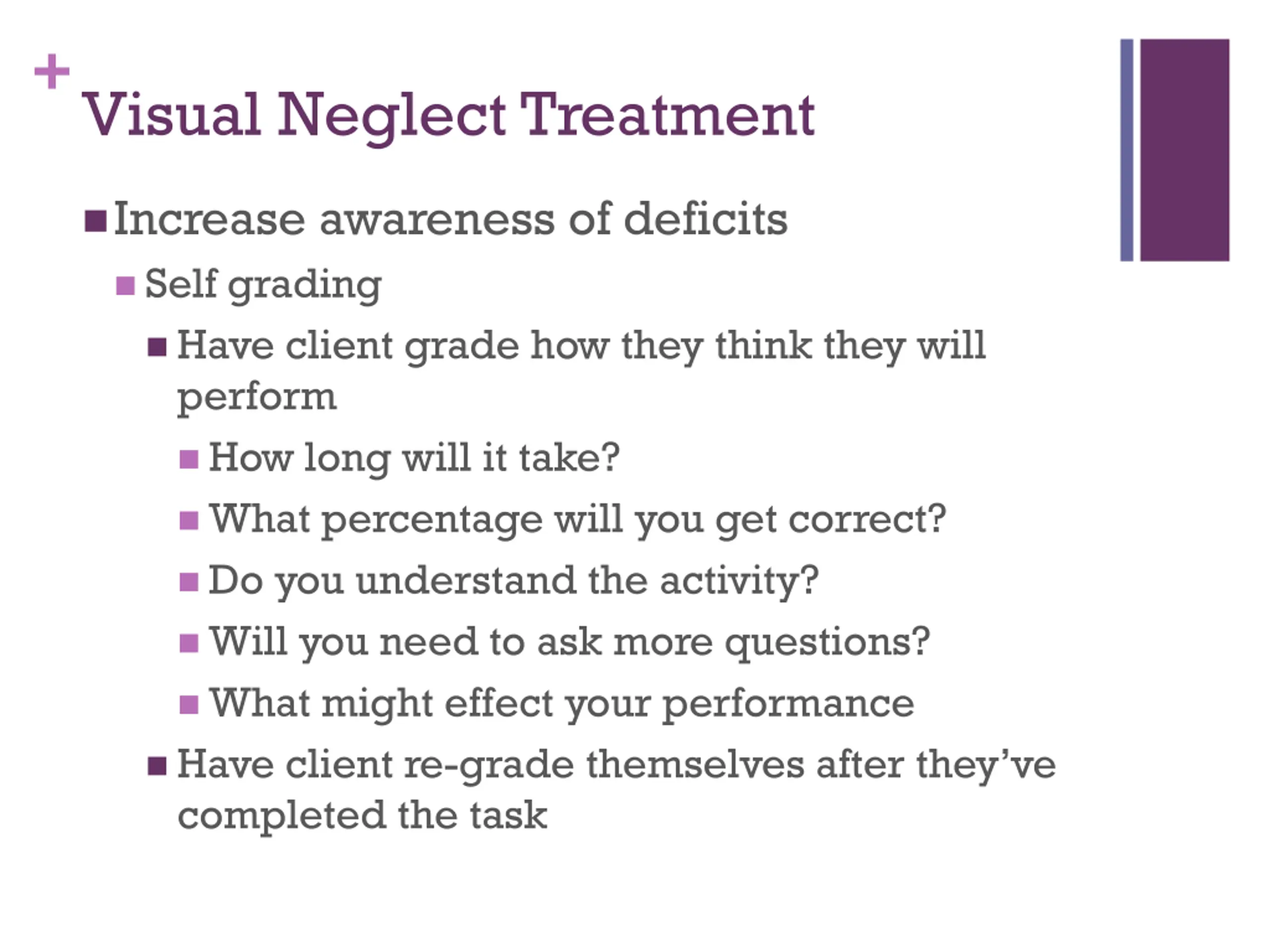 +Visual Neglect Treatment Increase awareness of deficits Self grading Have client grade how they think they will perform How long will it take? What percentage will you get correct? Do you understand the activity? Will you need to ask more questions? What might effect your performance Have client re-grade themselves after they ve completed the task