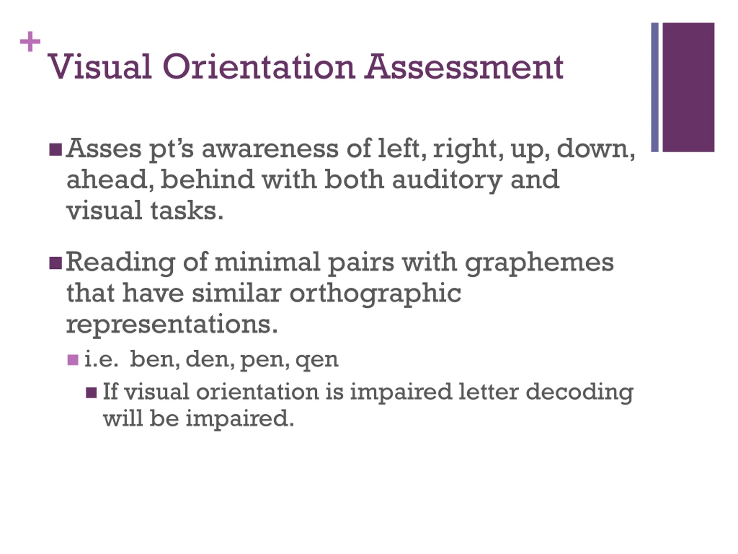 +Visual Orientation Assessment Asses pt s awareness of left, right, up, down, ahead, behind with both auditory and visual tasks. Reading of minimal pairs with graphemes that have similar orthographic representations. i.e. ben, den, pen, qen If visual orientation is impaired letter decoding will be impaired.