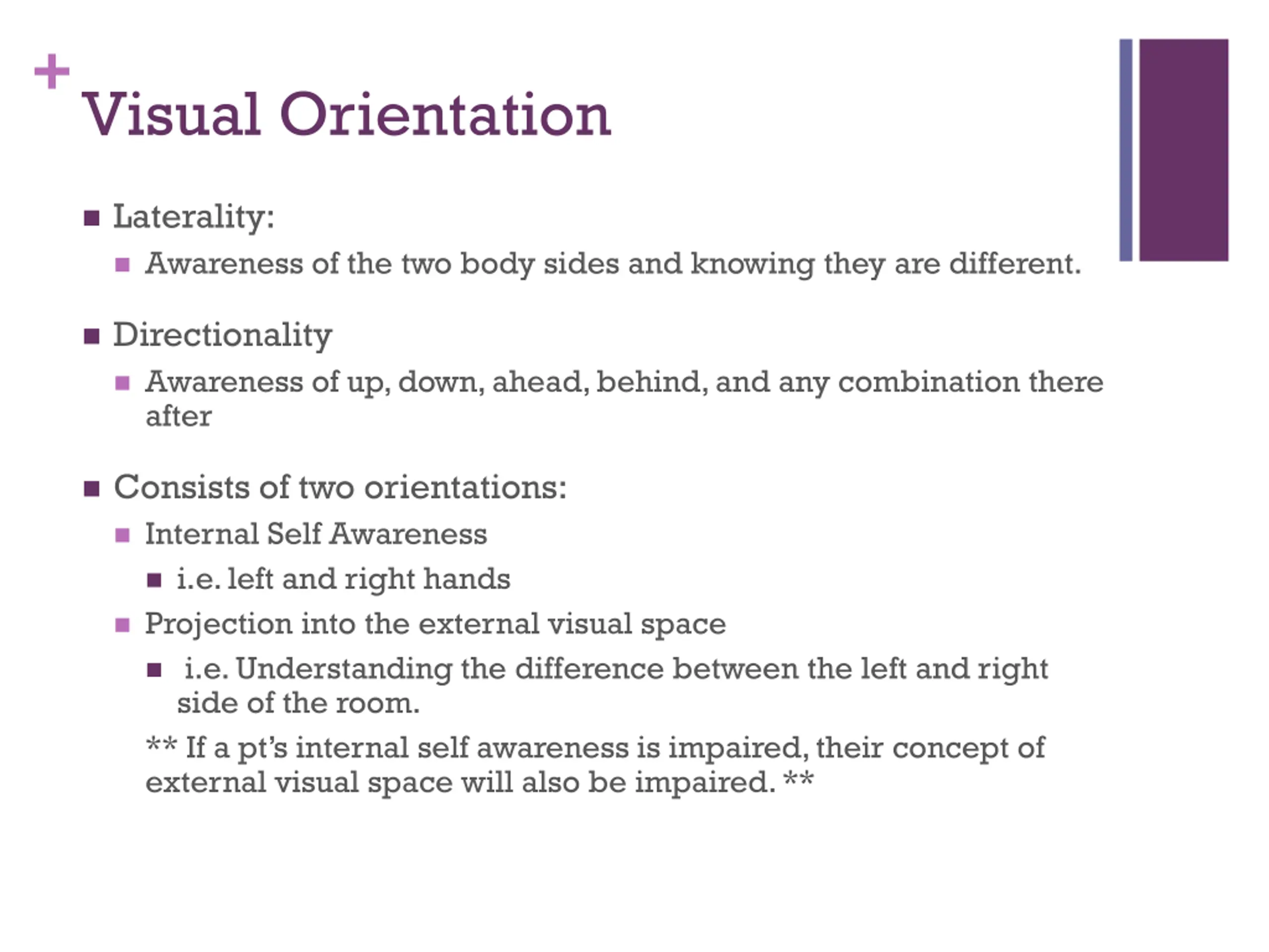 +Visual Orientation Laterality: Awareness of the two body sides and knowing they are different. Directionality Awareness of up, down, ahead, behind, and any combination there after Consists of two orientations: Internal Self Awareness i.e. left and right hands Projection into the external visual space i.e. Understanding the difference between the left and right side of the room. ** If a pt s internal self awareness is impaired, their concept of external visual space will also be impaired. **