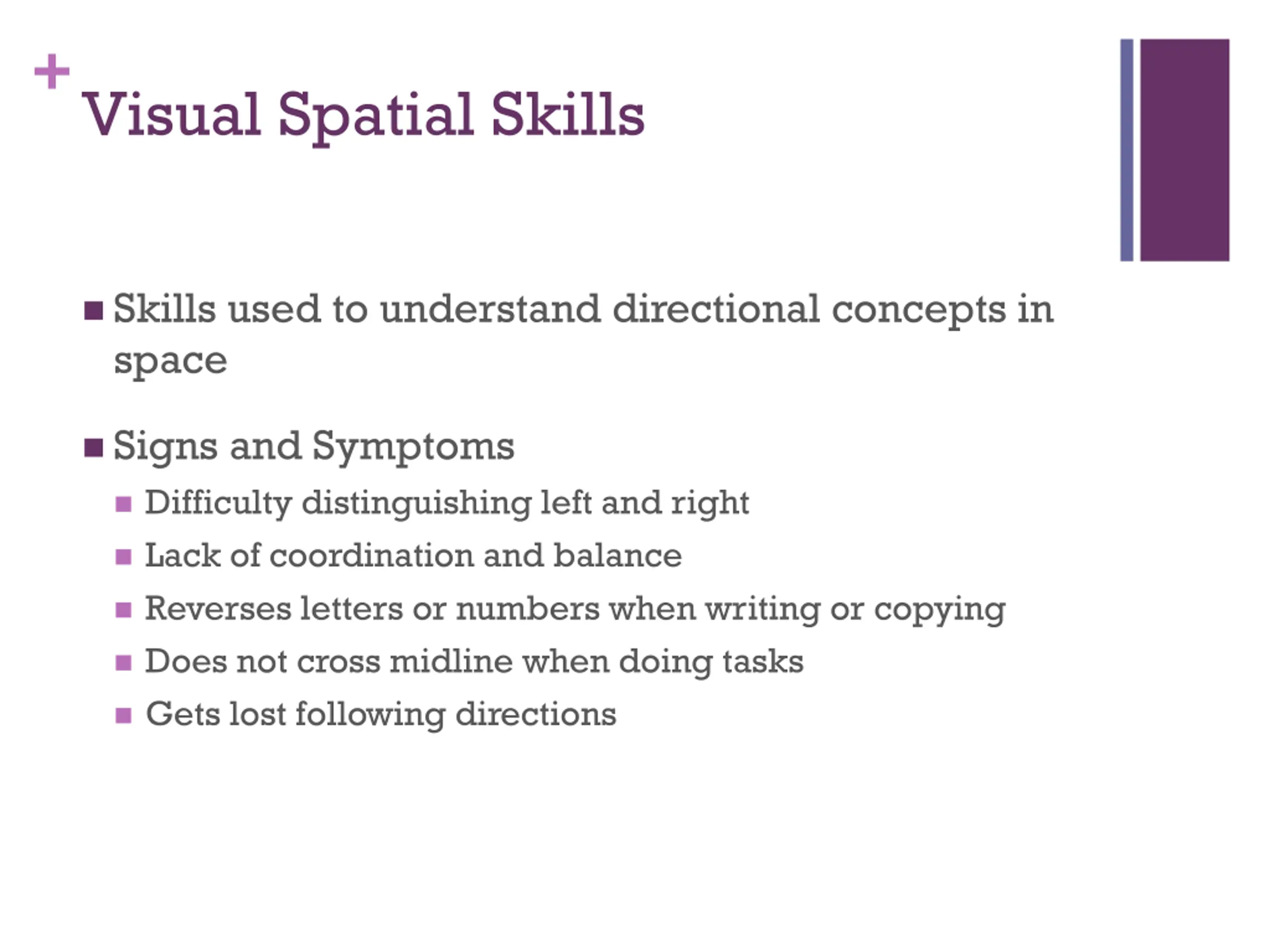 +Visual Spatial Skills Skills used to understand directional concepts in space Signs and Symptoms Difficulty distinguishing left and right Lack of coordination and balance Reverses letters or numbers when writing or copying Does not cross midline when doing tasks Gets lost following directions