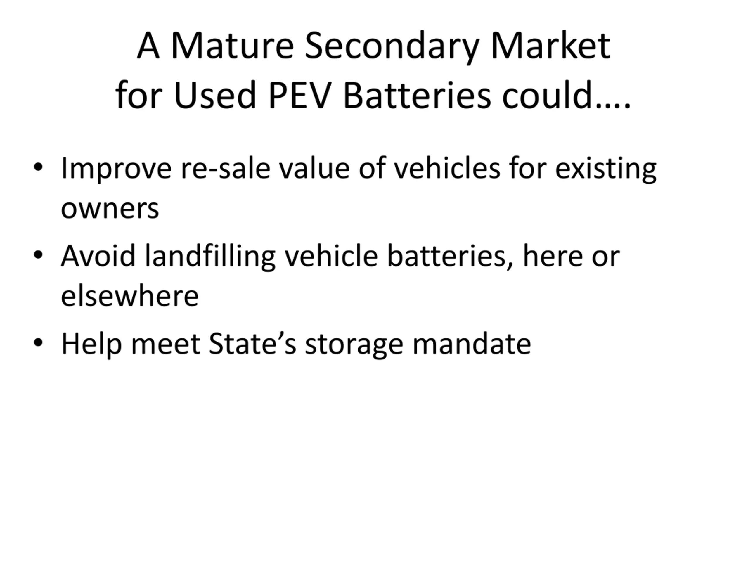 A Mature Secondary Market for Used PEV Batteries could . Improve re-sale value of vehicles for existing owners Avoid landfilling vehicle batteries, here or elsewhere Help meet State s storage mandate