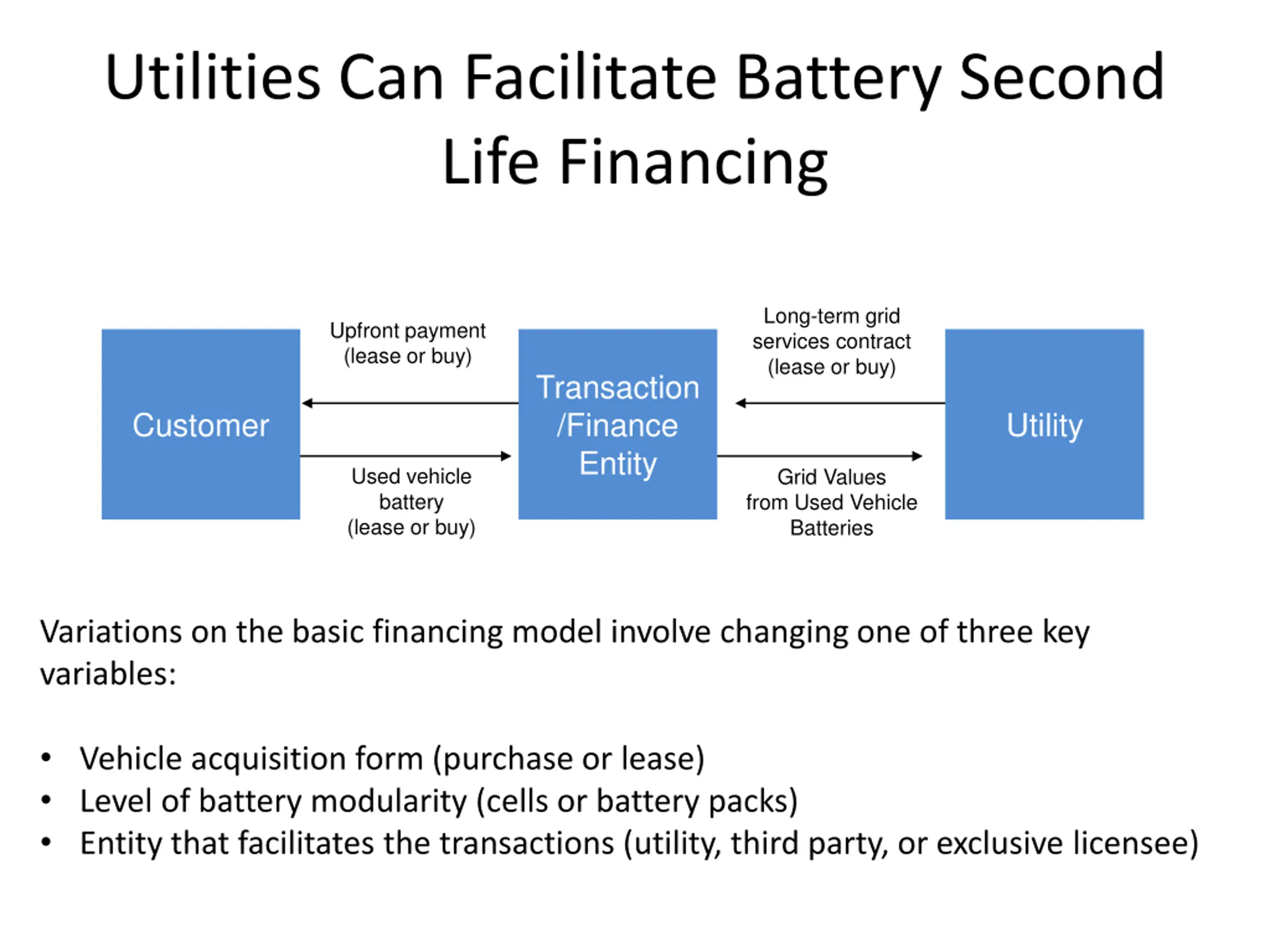 Utilities Can Facilitate Battery Second Life Financing Long-term grid services contract (lease or buy) Upfront payment (lease or buy) Transaction /Finance Entity Customer Utility Used vehicle battery (lease or buy) Grid Values from Used Vehicle Batteries Variations on the basic financing model involve changing one of three key variables: Vehicle acquisition form (purchase or lease) Level of battery modularity (cells or battery packs) Entity that facilitates the transactions (utility, third party, or exclusive licensee)